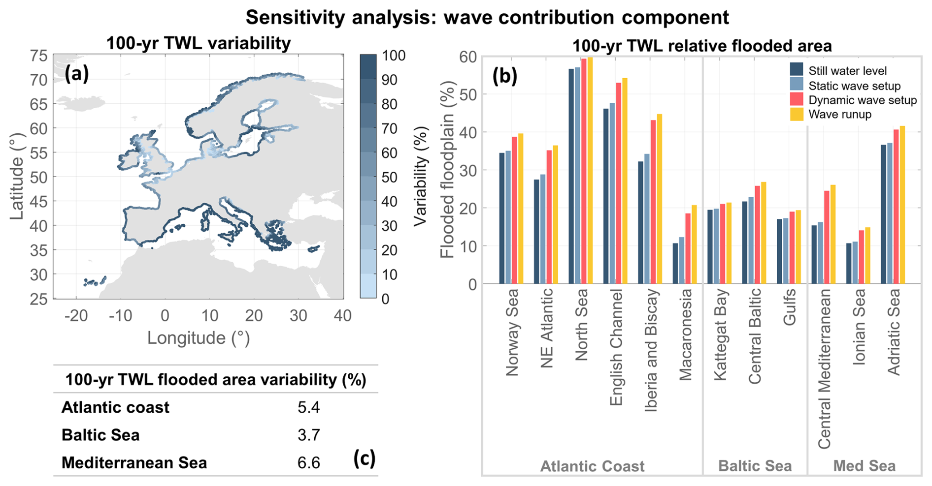 Figure 7Sensitivity analysis of the wave contribution considered in the TWL reconstruction: still water level (SWL) vs. SWL combined with static wave setup vs. SWL with dynamic wave setup vs. SWL with wave runup. (a) 100 year TWL variability found in the results. (b) Results of flooded area proportional to the floodplain in each European basin considering the 100 year TWL. (c) Variability of 100 year TWL flooded area per European region.