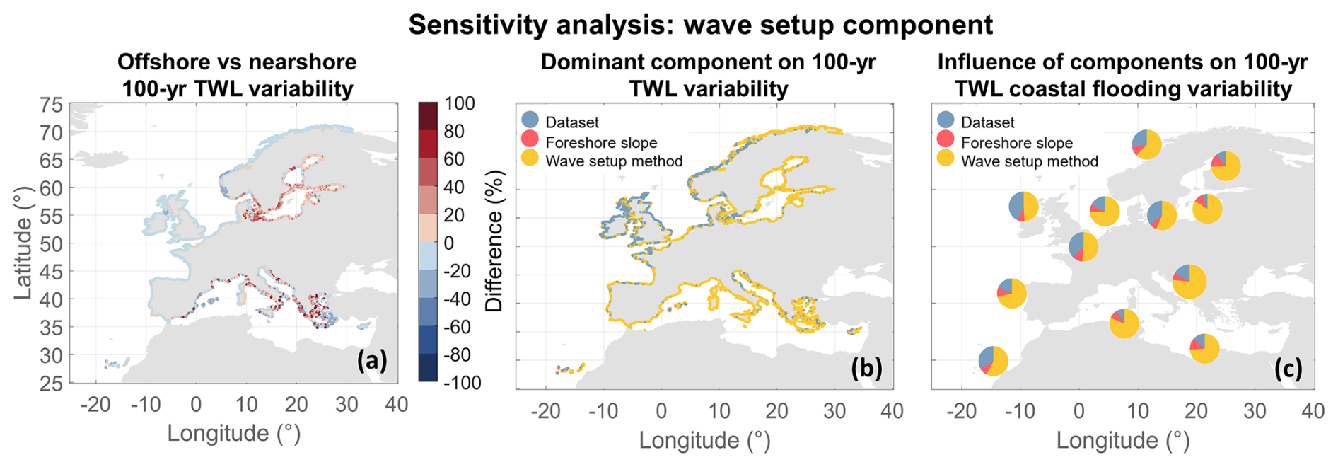 Figure 8Sensitivity analysis of the wave setup components: data resolution, foreshore slope approximation, and wave setup formulation. (a) Differences in 100 year TWL when applying offshore instead of nearshore wave conditions. This plot isolates the influence of wave data resolution by comparing TWL approach D against A as presented in Table 2. (b) Dominant component explaining the 100 year TWL variability. (c) Influence of wave setup components on the 100 year flooded area variability averaged per EU basin.