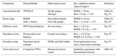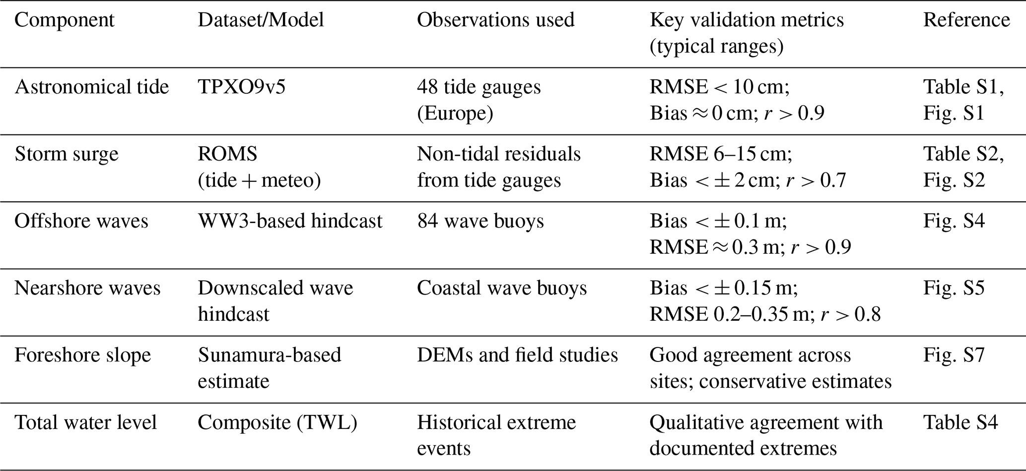 The modeling chain used to reconstruct TWL combines independent, state-of-the-art datasets for tides, storm surges, and waves, each of which was validated against available observations prior to their integration. Table 1 presents a summary of the validation results. Astronomical tides derived from TPXO9v5 were validated against 48 tide-gauge records distributed along the European coastline, showing high skill in reproducing tidal amplitudes and phases, with root mean square errors typically below 10 cm, biases close to zero, and Pearson correlation coefficients exceeding 0.9 at most locations (Table S1, Fig. S1). The storm surge hindcast generated with ROMS was validated against non-tidal residuals from the same tide-gauge network, yielding RMSE values generally between 6 and 15 cm, low bias, and correlation coefficients above 0.7 across most stations (Table S2, Fig. S2).