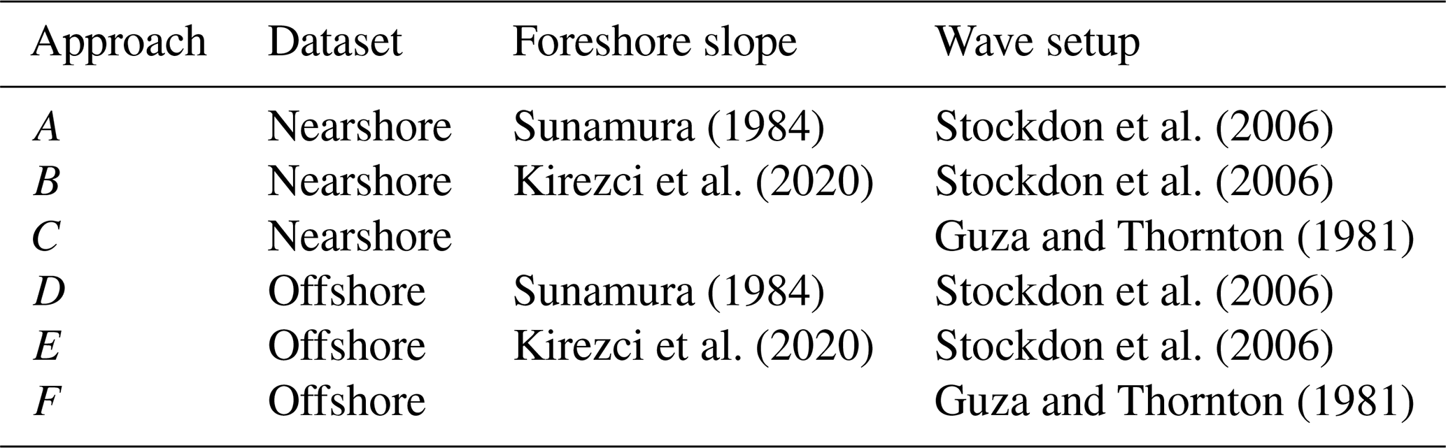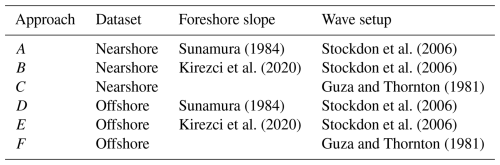 For the comparison of foreshore slope approximations, we applied variable slopes (Sunamura, 1984) to offshore wave conditions and also adopted a constant foreshore slope of 0.03 (Kirezci et al., 2020). Both foreshore slope options were used in conjunction with the semi-empirical wave setup formulation shown in Eq. (2) (Stockdon et al., 2006) and with both wave datasets. In total, 6 approaches were tested, as shown in Table 2. While approach A represents the methodology proposed in the present study, the remaining approaches were only used in this sensitivity analysis.