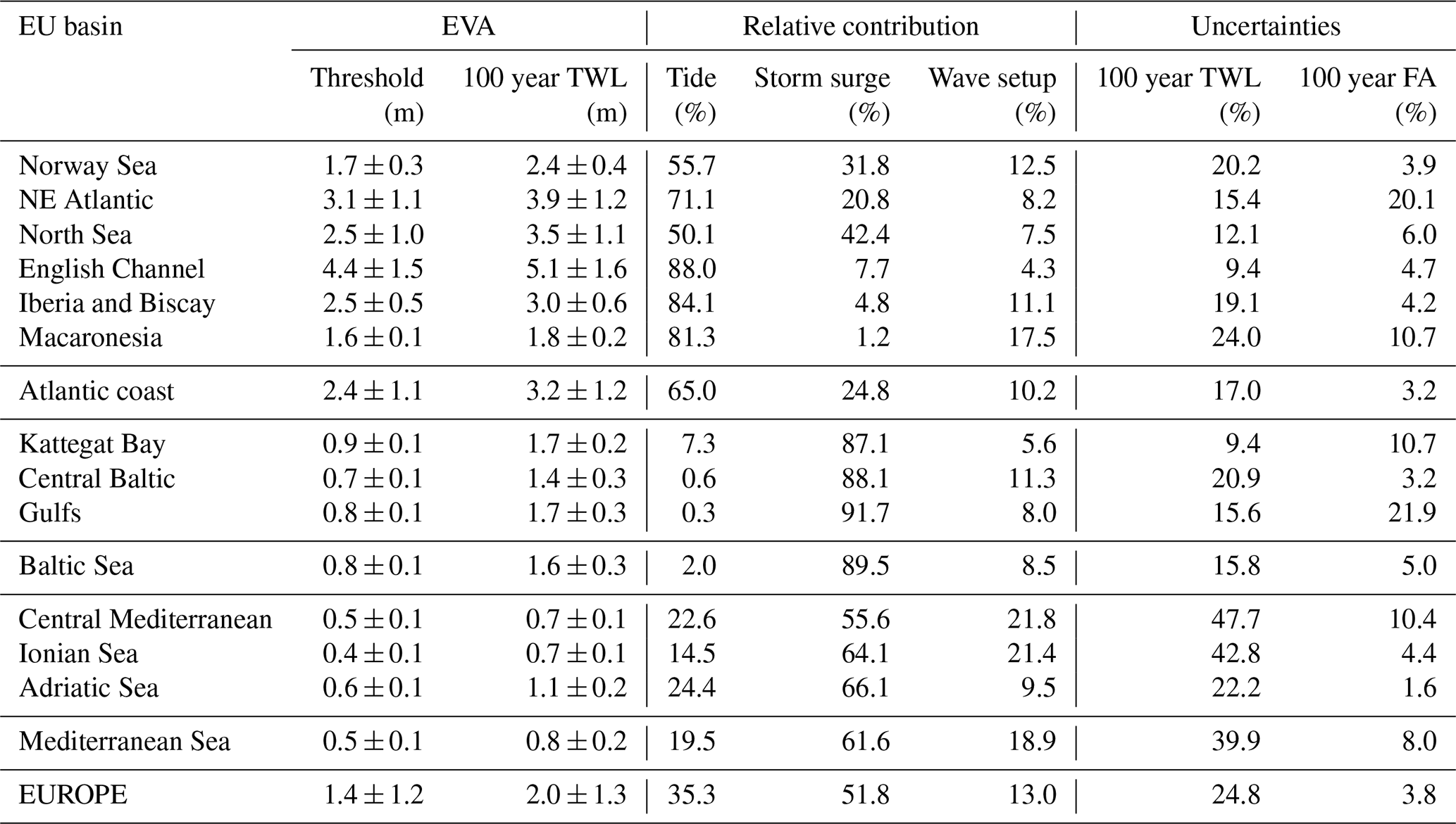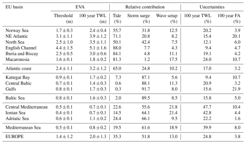 Table 3Characterization of the study area based on TWL extremes and aggregated per EU basin, region, and the entire study area. EVA results are summarized as TWL threshold corresponding to a λ=2 and 100 year TWL (mean ±standard deviation), following the proposed methodology. Relative contributions refer to average per basin and considering all peaks identified by POT. Uncertainty quantification considers all sensitivity analyses performed, including the ones presented in the Supplement (i.e., wave contribution, wave setup elements, TWL resolution, POT threshold, and POT minimum interval).