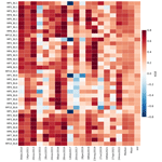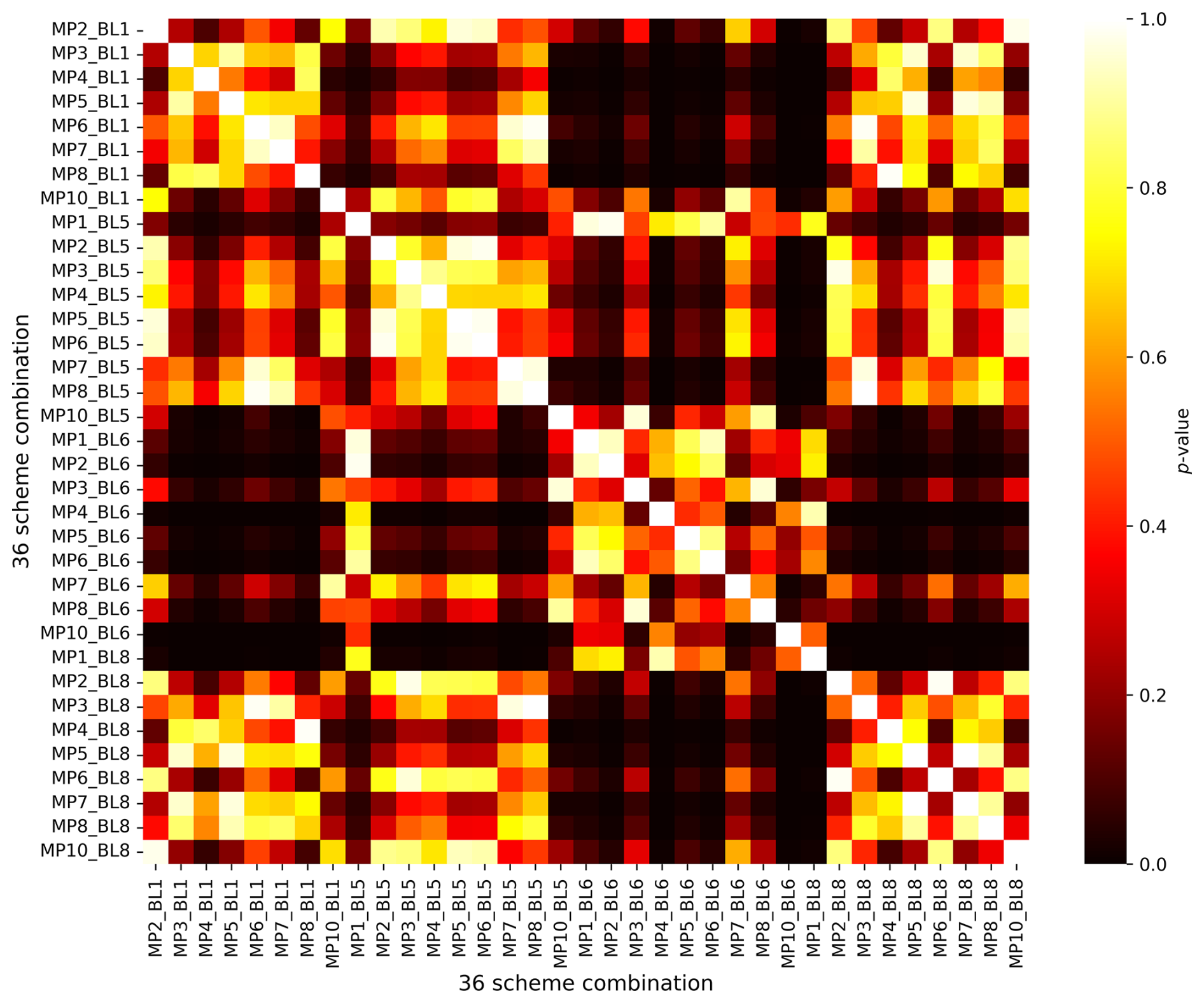 Figure 4Pairwise p values from independent t tests comparing the ΔKGE distributions of 36 scheme combinations for rainfall. ΔKGE values were calculated by subtracting the mean KGE across EREs from the KGE values presented in Fig. 2. A p threshold of 0.1 was used to identify statistically significant differences between scheme combinations.