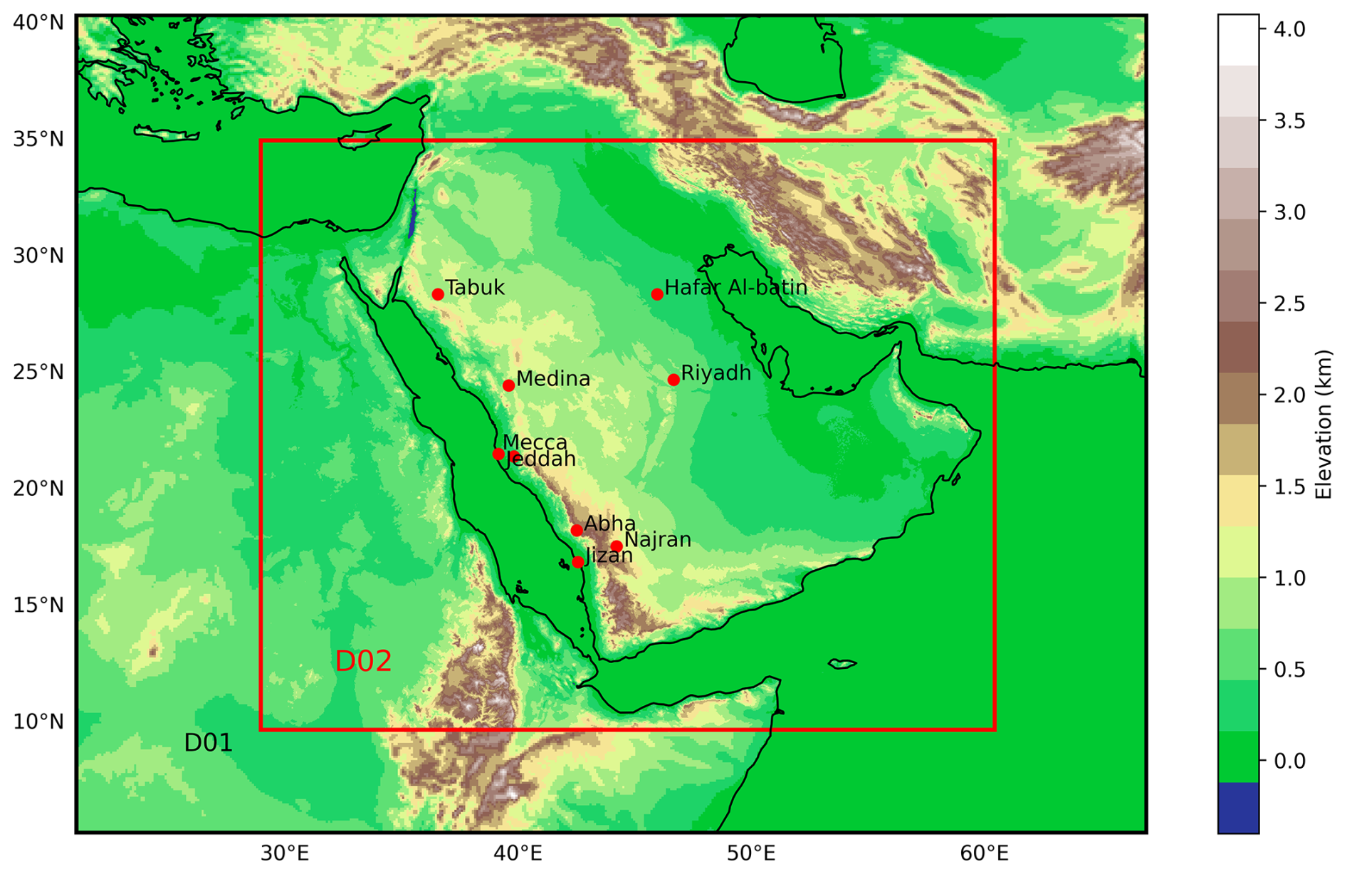 Deng et al. (2015)Attada et al. (2020)Schwitalla et al. (2020)Taraphdar et al. (2021)Attada et al. (2022)Saudi Arabia, covering 80 % of the AP, spans from 16–33° N and 34–56° E, with an area of approximately 2.1 million km2, making it the largest country in the Middle East and the 12th largest globally. The terrain includes highlands, volcanic fields, mountain ranges, and the vast Arabian desert, featuring the Rub' al Khali, the world's largest continuous sand desert. Despite lacking permanent rivers, it has many wadis, alluvial deposits (Vincent, 2008; WeatherOnline, 2024), and about 1300 islands in the Arabian Gulf and the Red Sea. The central plateau stretches from the Red Sea to the Arabian Gulf, while the Asir province reaches 3002 m above sea level at Jabal Ferwa, and the Hejaz region contains approximately 2000 extinct volcanoes across 180 000 km2. The climate is characterized by vast deserts, rugged mountains, and a hyper-arid climate, with extreme summer temperatures of 45–54 °C and winters rarely below 0 °C (De Vries et al., 2016; El Kenawy et al., 2014; Mostamandi et al., 2022; Ukhov et al., 2020). The average annual rainfall over the region is about 63 mm, except in the southwest, where monsoons bring over 300 mm of rain from October to March (Wang et al., 2025).