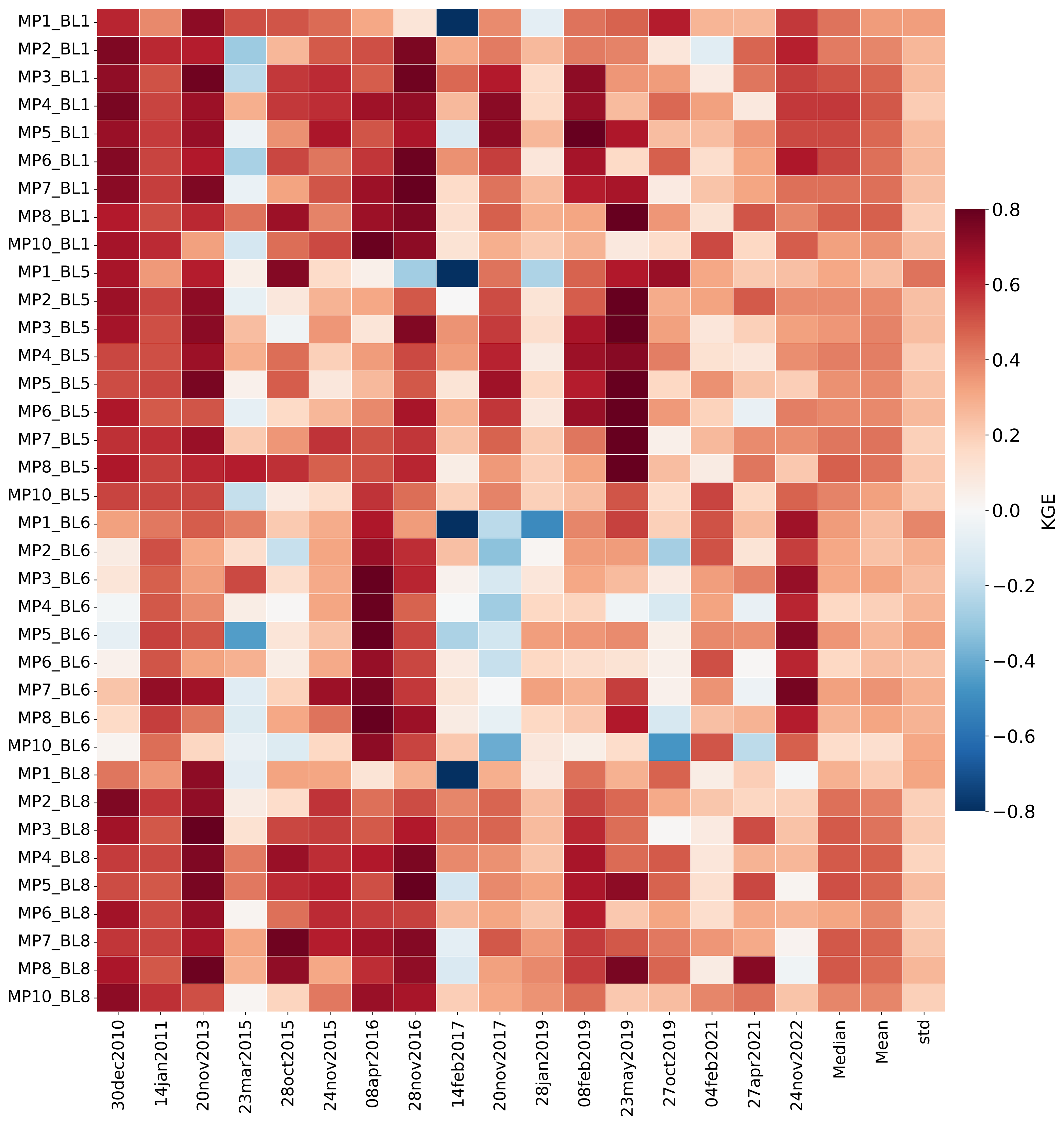 Pairwise statistical tests between distributions of temporal KGE scores obtained by the scheme combinations revealed that the MP8_BL1 combination significantly outperformed 21 other scheme combinations, while the poorest-performing combination, MP10_BL6, was statistically inferior to 28 other combinations. Thus, we could not statistically identify a single best- or worst-performing combination, despite the large sample of 17 EREs. - e.
