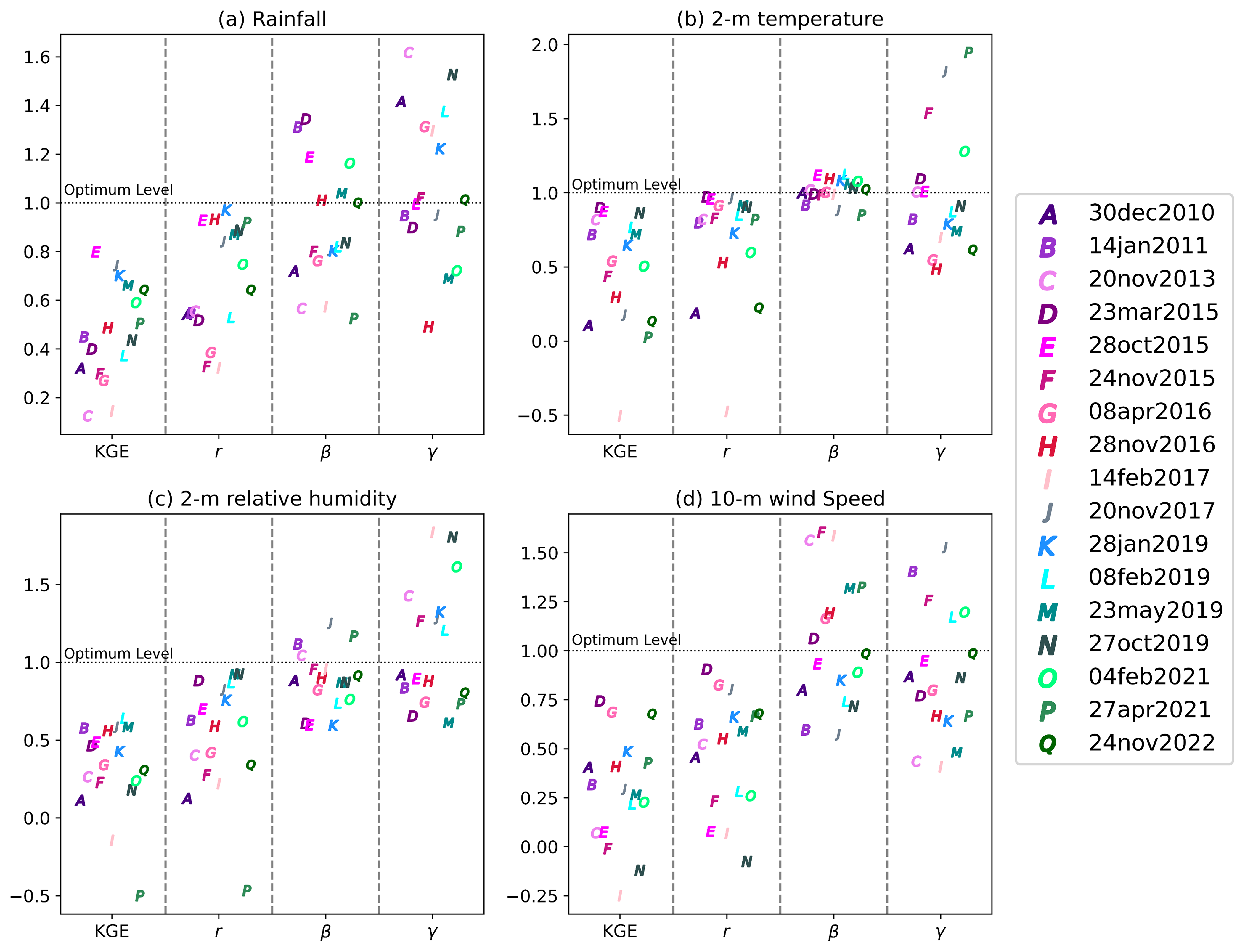 Figure 3Correlation coefficient (r), bias (β), and variability ratio (γ) values used to calculate the KGE values for the best-performing combination across 17 EREs for (a) Rainfall, (b) 2 m air temperature, (c) 2 m relative humidity, and (d) 10 m wind speed. Panel (a) uses IMERG-Final V07 as reference and panels (b)–(d) METAR observations over each 24 h event day. The letters (A, B,..., Q) indicate the 17 different EREs (Table 2).