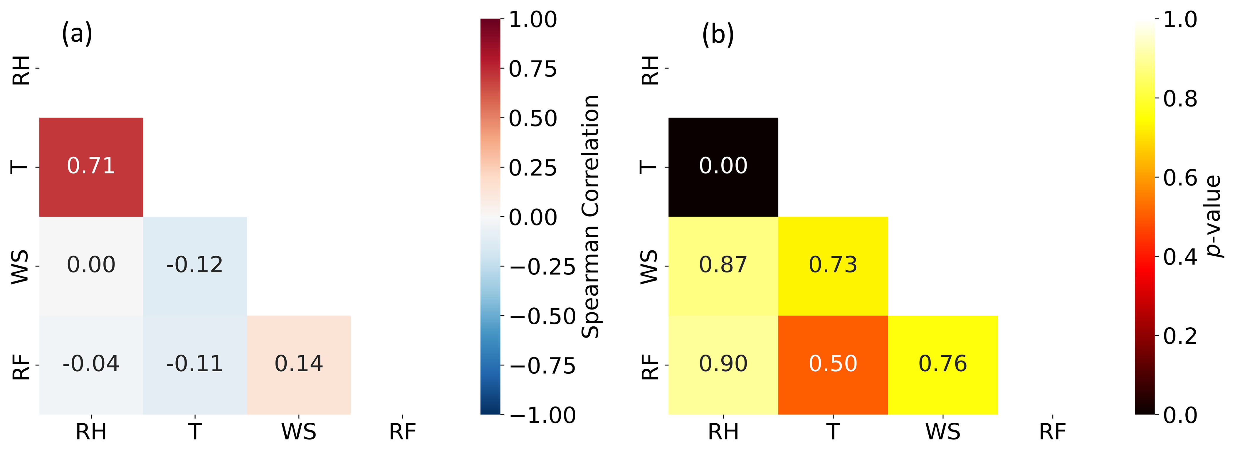 Figure 5(a) Mean Spearman correlation coefficients and (b) corresponding median p values calculated among mean KGE scores for different meteorological variables, indicating the degree of consistency in performance rankings among variables. Variable definitions: 2 m relative humidity = RH; 2 m air temperature = T; 10 m wind speed = WS; and rainfall = RF.