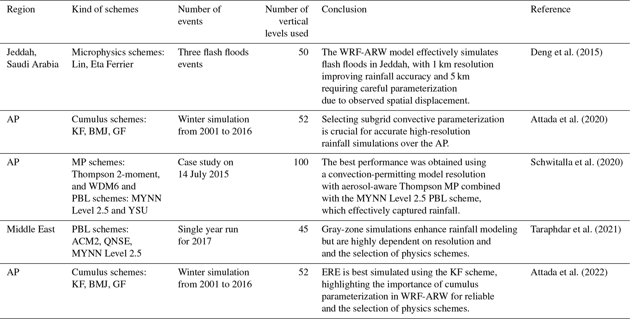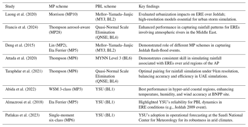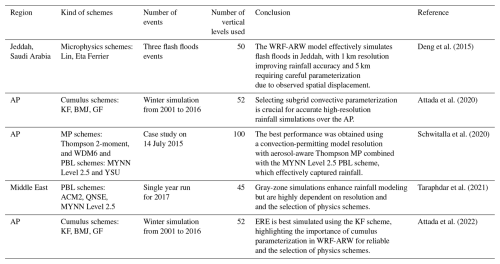 Although several previous studies have evaluated different WRF-ARW parameterization schemes in the AP (e.g., Deng et al., 2015; Schwitalla et al., 2020; Attada et al., 2022; Abida et al., 2022) and in other arid and semi-arid regions (e.g., Zittis et al., 2014; Tian et al., 2017; Liu et al., 2021; Messmer et al., 2021; Mekawy et al., 2022), they have typically focused on individual EREs and conducted limited sensitivity analyses using a small number of parameterization schemes (Table 1). The case-specific nature of these studies often restricts the generalizability of their results to other EREs and varying conditions, reducing their broader applicability for predicting EREs in the complex climate dynamics of the AP.