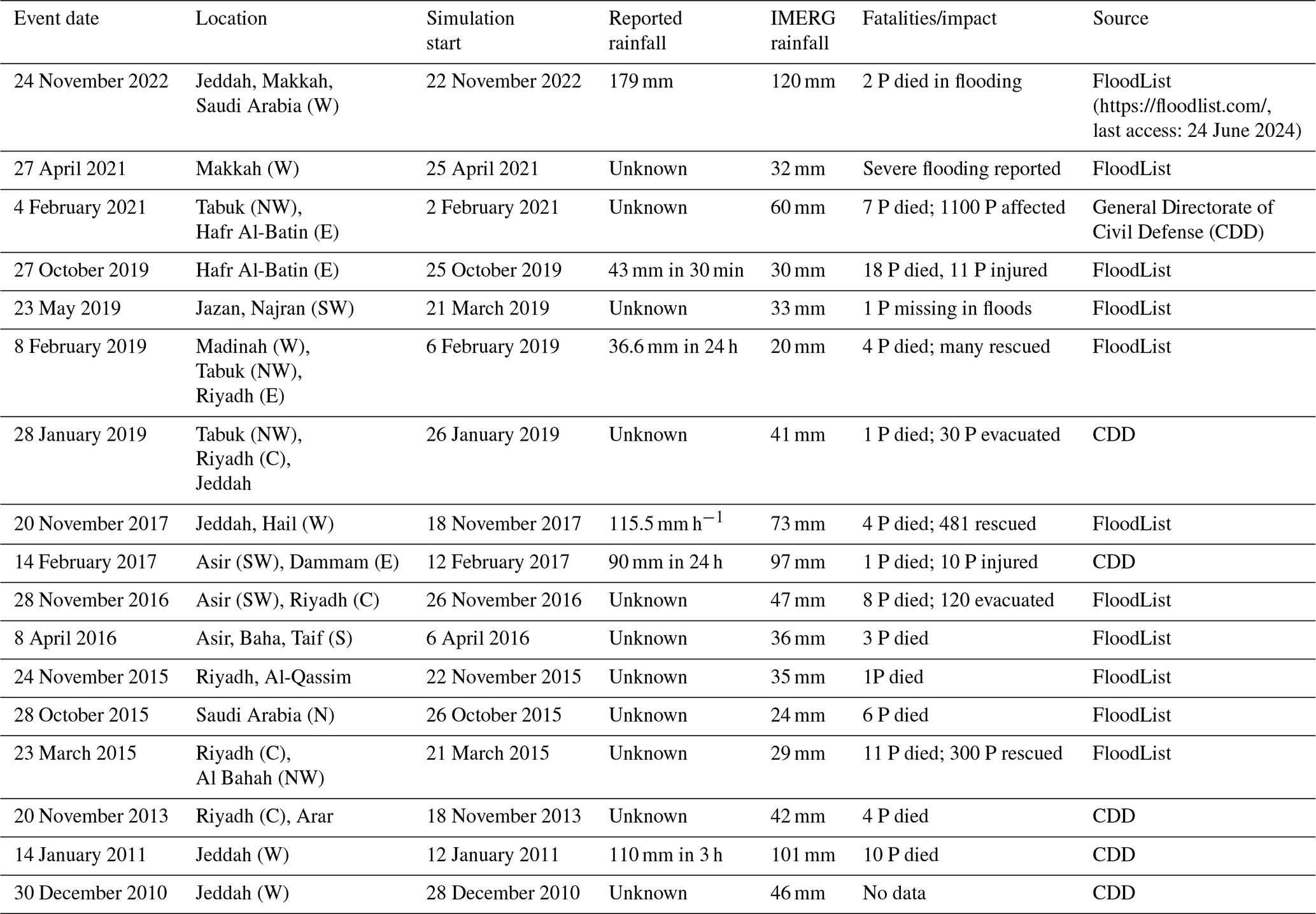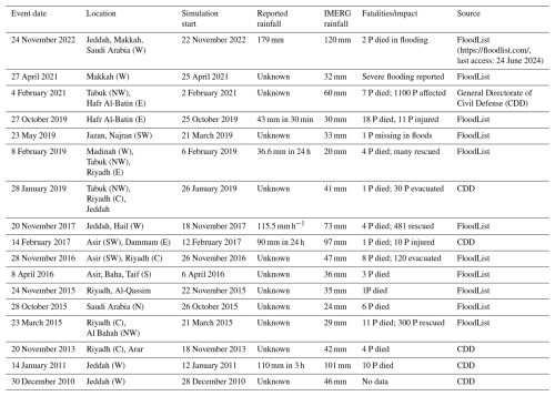 Table 2EREs across the AP selected to determine the performance of different MP and PBL scheme combinations. All simulation start times are at 00:00 UTC. IMERG-Final V07 rainfall values represent 24 h totals from simulation start for the 0.1° grid-cell with the highest amount for each ERE. Abbreviations: N = north, E = east, S = south, W = west, P = people.