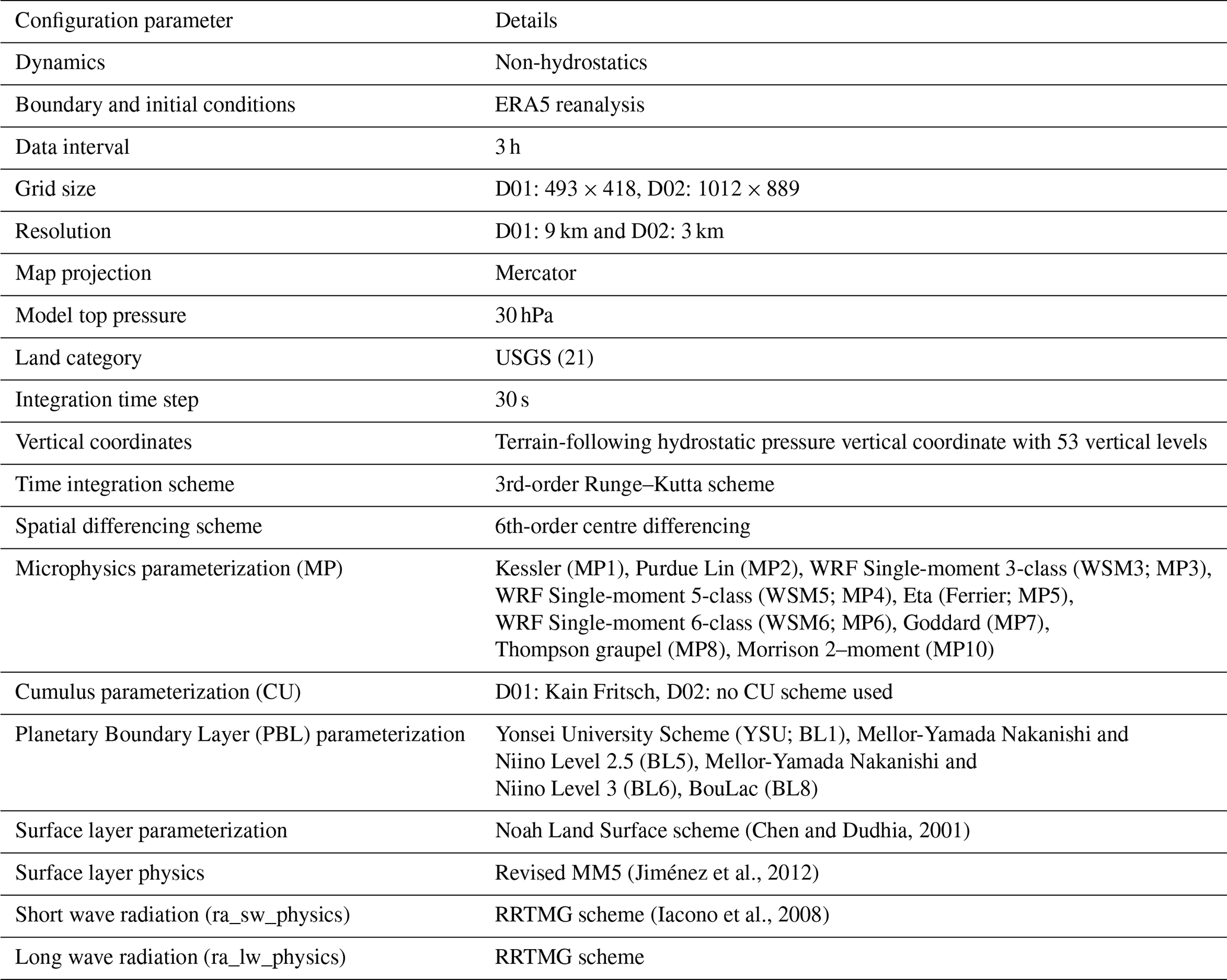 ERA5 pressure-level data (with 37 levels, extending up to approximately 30 km altitude; 0.25° spatial resolution) was utilized to provide initial and boundary conditions for each 3 h time step to run WRF-ARW. ERA5 is the most reliable reanalysis currently available and was therefore used for this purpose (Hersbach et al., 2020). The data were obtained from the Copernicus Climate Data Store (CDS; https://cds.climate.copernicus.eu, last access: 24 June 2024). ERA5 also provides model-level fields, which offer a finer native representation of the vertical structure, particularly in the boundary layer and near the tropopause. Using model levels for all 17 EREs and 36 parameterization combinations (612 simulations) would substantially increase the initial-condition data volume and I/O burden, particularly when combined with a denser WRF vertical grid, which further increases computational cost. We therefore used pressure levels as a pragmatic compromise, and our results should be interpreted with the caveat that some small-scale vertical features may be under-resolved.