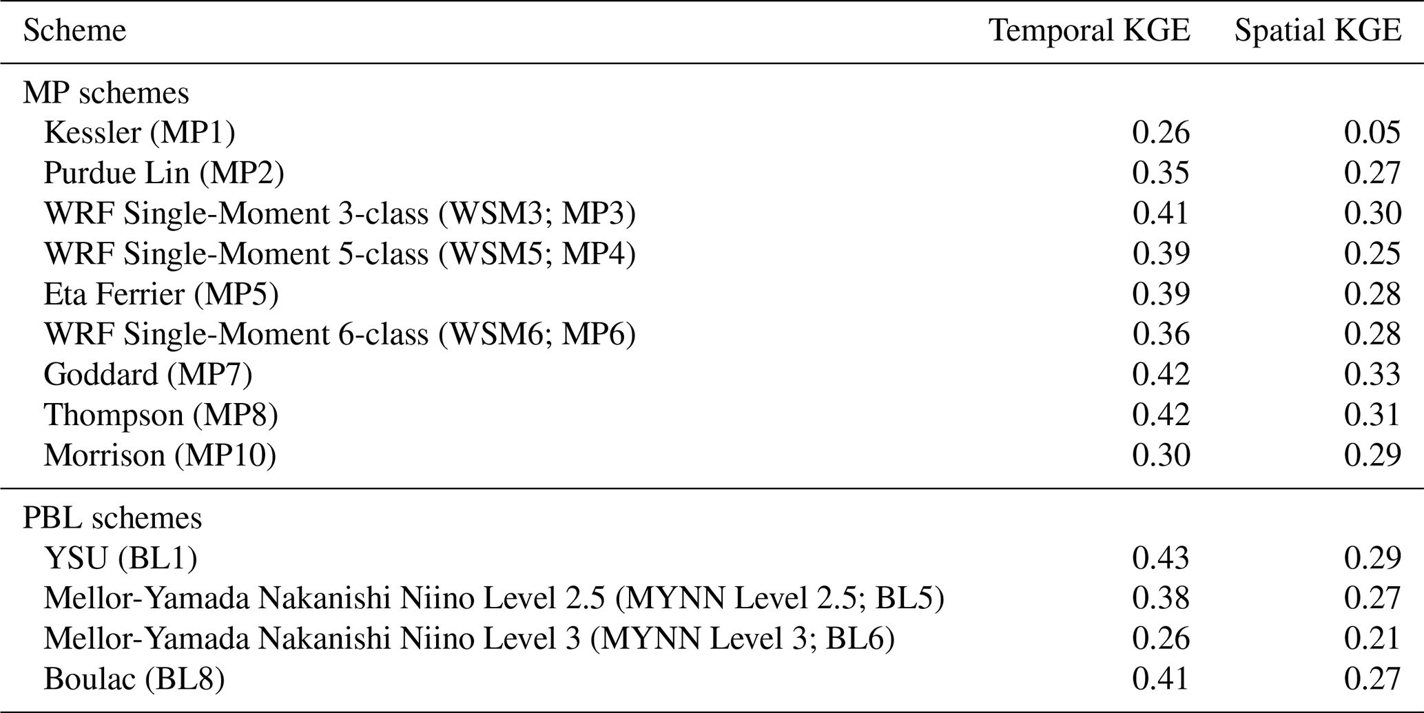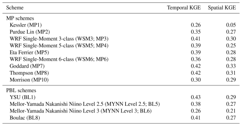Table 4Mean KGE values across all simulations for temporal and spatial assessments of MP and PBL schemes.