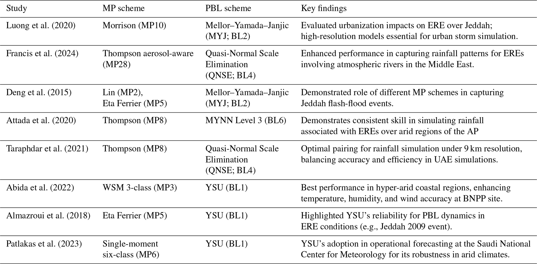 Advanced Research version of the Weather Research and Forecasting (WRF-ARW; Skamarock et al., 2019) is a widely used Numerical Weather Prediction (NWP) model in the Arabian Peninsula (AP) to simulate and forecast EREs (Deng et al., 2015; Taraphdar et al., 2021; Luong et al., 2025; Francis et al., 2025). These models are subject to various sources of uncertainty, particularly due to parameterizations. Two key parameterization schemes that strongly influence ERE simulations include the Planetary Boundary Layer (PBL) and cloud microphysics (MP) schemes.