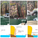 The cases mentioned above are extreme, whereas the phenomena of sliding, toppling, and falling of cliffs in small lakes and reservoirs are quite frequent and have been captured by various people around the globe. Figure 1a–c indicates a rotational (topple) cliff collapse in Furnas Lake, Brazil, on 8 January 2022, killing 10 people (Maciel et al., 2023; Sun et al., 2024). As a result of the collapse, a huge splash and induced waves can be seen in Fig. 1c. Despite recurring events of cliff collapse along the water banks, the rotational failure of cliffs accompanied by fragmentation upon impact with the water surface remains poorly understood. Recent studies on water waves have focused on block slides, translational slides, or granular flows, where the mass moves along a predefined basal plane. Moreover, physical modeling has also been carried out to analyse the amplitude and runup of the landslides-induced water waves either by using block slide or granular slide (Heller and Spinneken, 2015, 2013; Lindstrøm, 2016; Lindstrøm et al., 2014; McFall and Fritz, 2016; Miller, 1960; Mohammed and Fritz, 2012; Montagna et al., 2011; Romano et al., 2023, 2020; Sælevik et al., 2009; Yin et al., 2015). However, the rotational collapse is different from the type of failure mentioned above. In rotational collapse, the cliff rotates along the base and falls into water, thus inducing a huge splash and fragmenting upon impact.