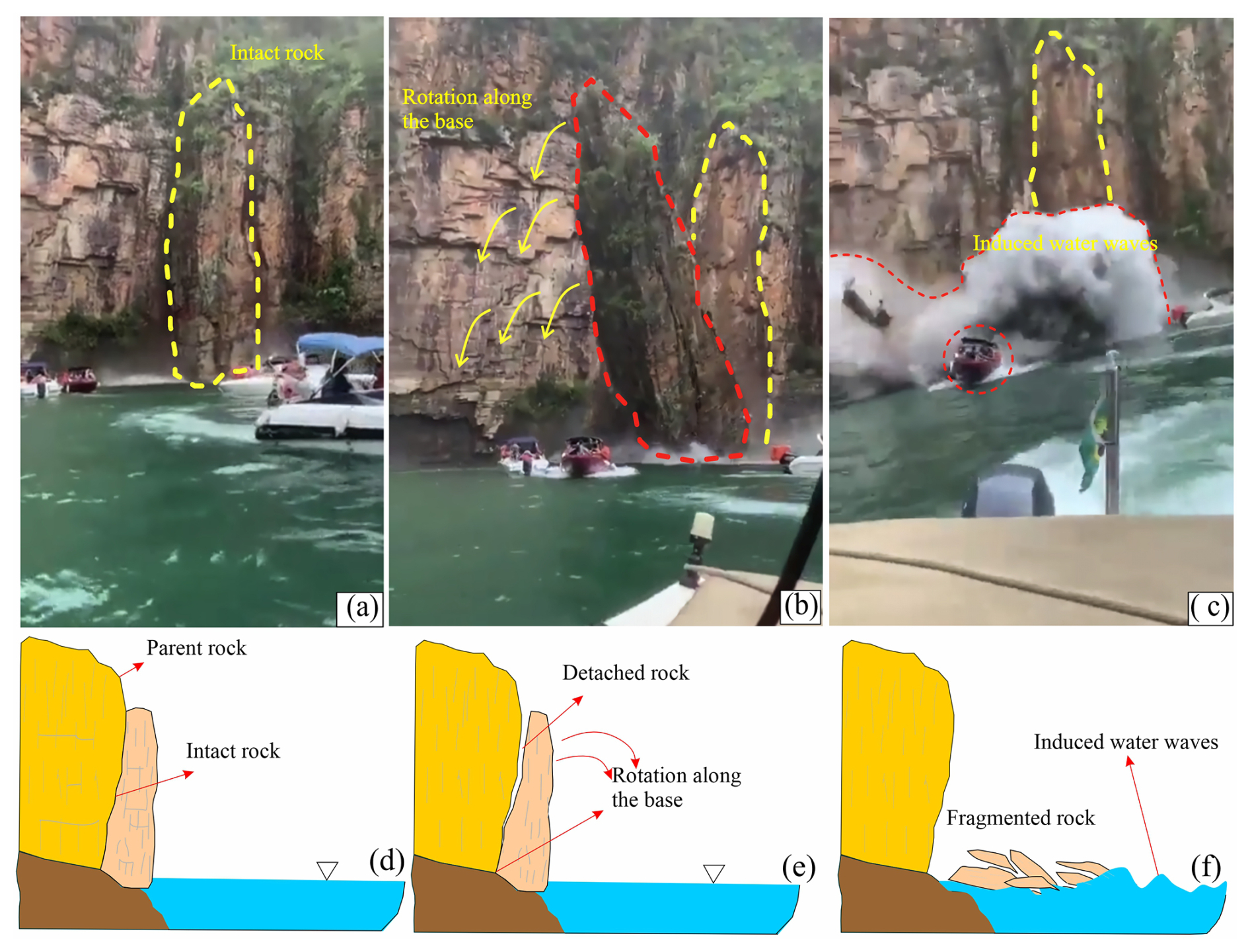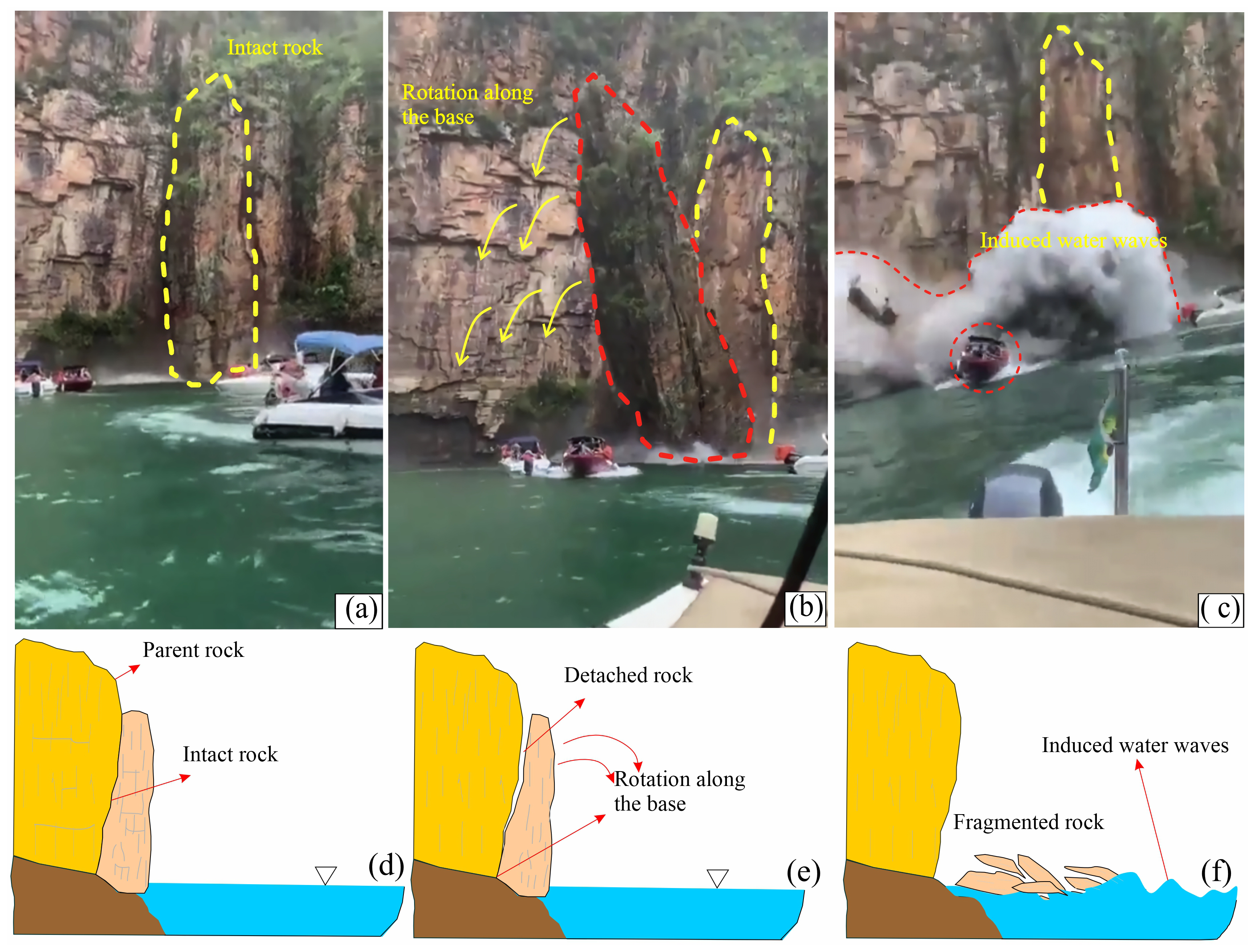 Figure 1(a–c) Waves induced by a cliff collapse in Lake Furnas, Brazil. (d–f) Sketch diagram indicating the detachment and rotational fall process.