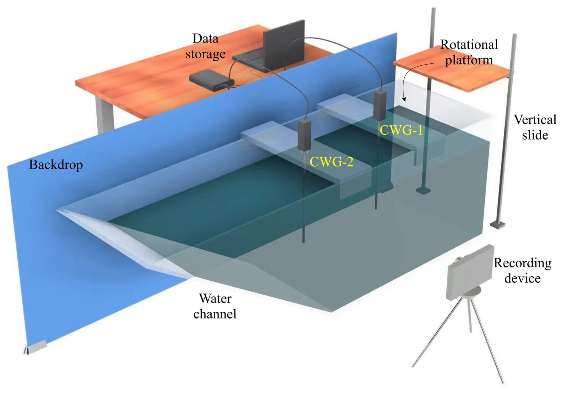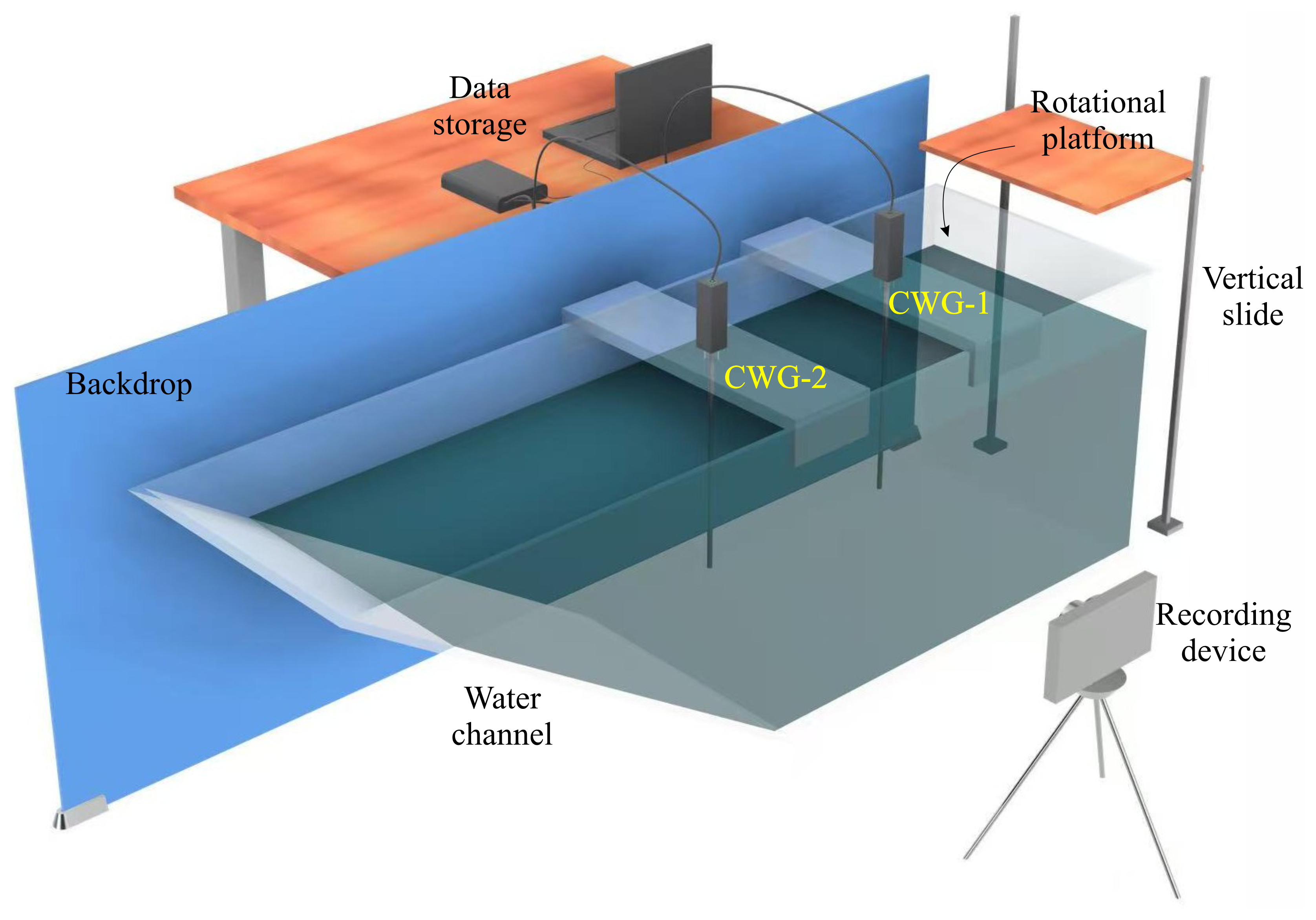 Figure 2Illustration of experimental setup including wave gauges, rotational platform, recording, and data storage devices.