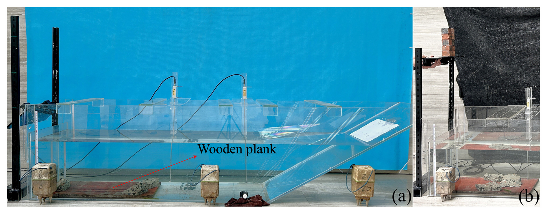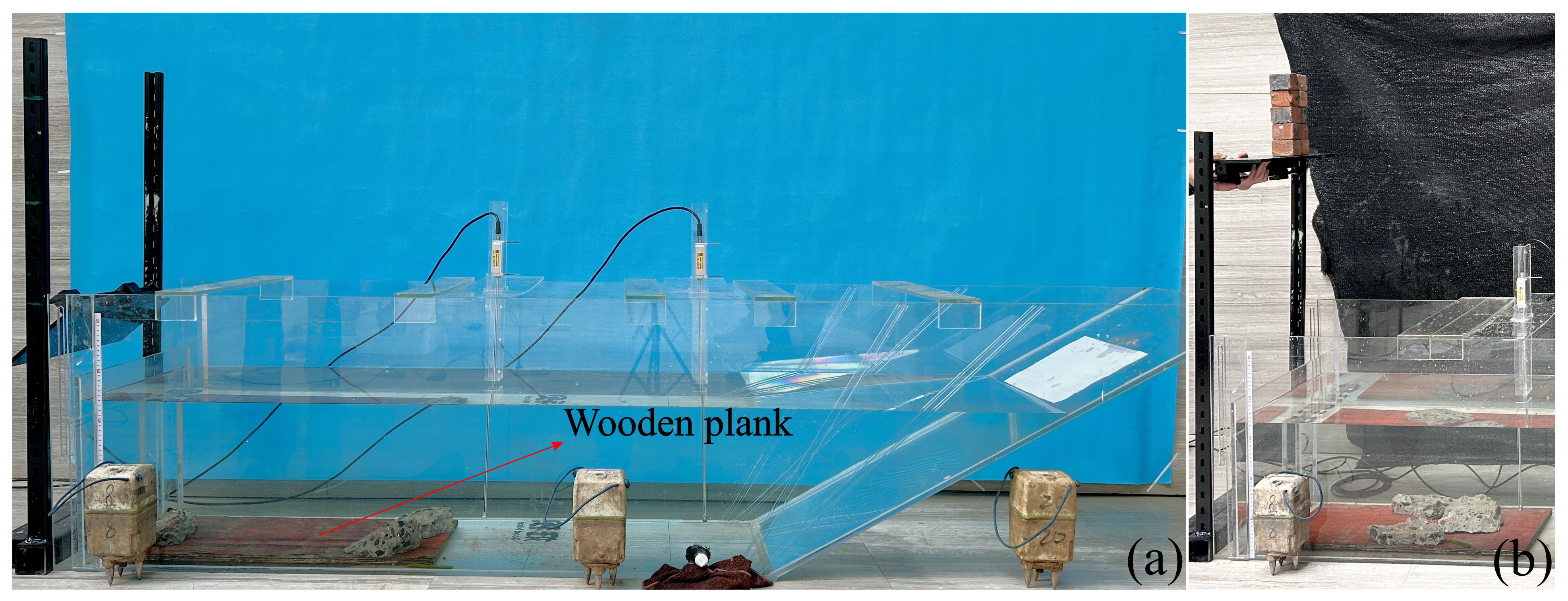 Furthermore, to reduce the impact of falling blocks on the base of the flume, a wooden plank weighing 2.69 kg and dimensions was placed at the point of impact inside the flume. Due to its large surface area and lighter density, it tends to float in the flume, so two blocks of concrete weighing 3.58 kg were placed on it, Fig. 3a. Since the fall height was small, no considerable local breakage was observed in the blocks, and the brief water contact minimised the water absorption effect.