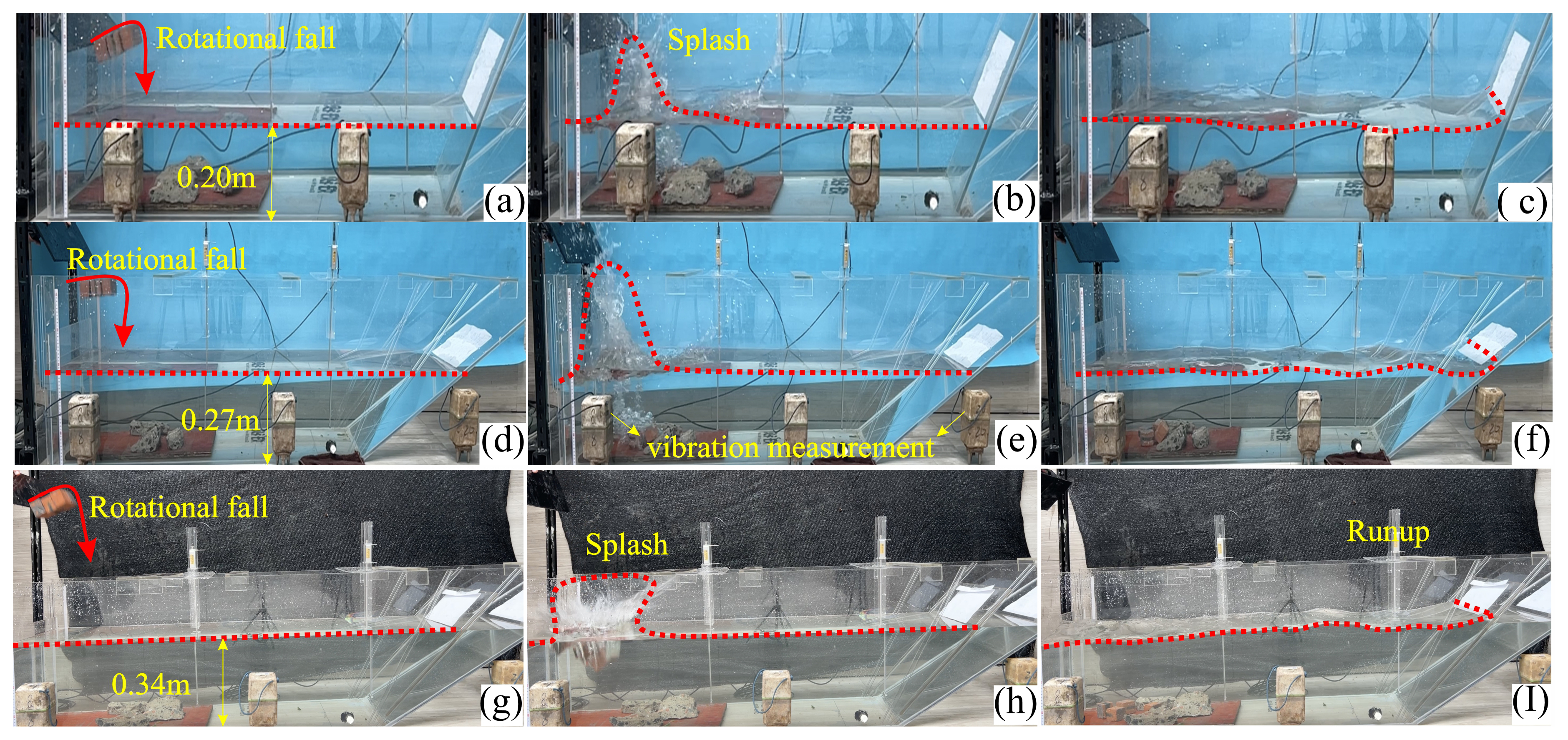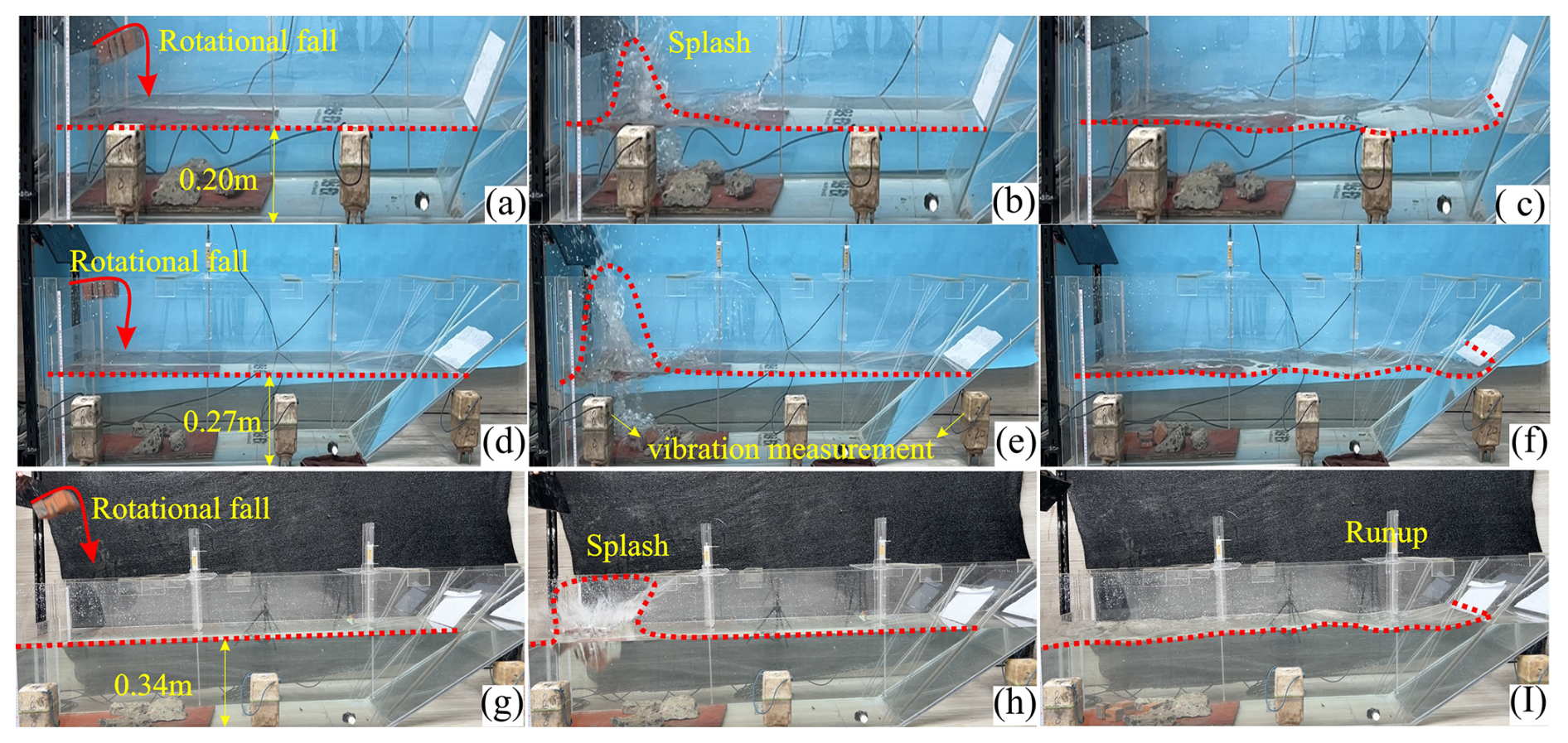Figure 5A pictorial display of the experimental setup for various water depths, i.e., 0.20, 0.27, and 0.34 m. (a, d, g) indicate rotational fall of the cliff, (b, e, h) showing splash as a result of cliff impact, (c, f, i) formation and propagation of induced wave and runup at various slope angles.