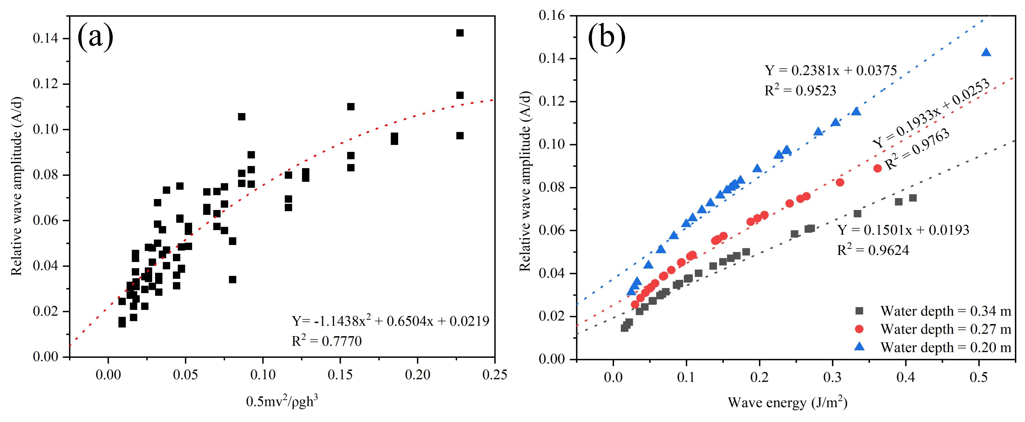 Figure 6(a) Dimensionless impact energy () vs. relative wave amplitude, indicating a nonlinear trend. (b) Wave energy vs. relative wave amplitude, indicating higher wave amplifications in shallow waters.