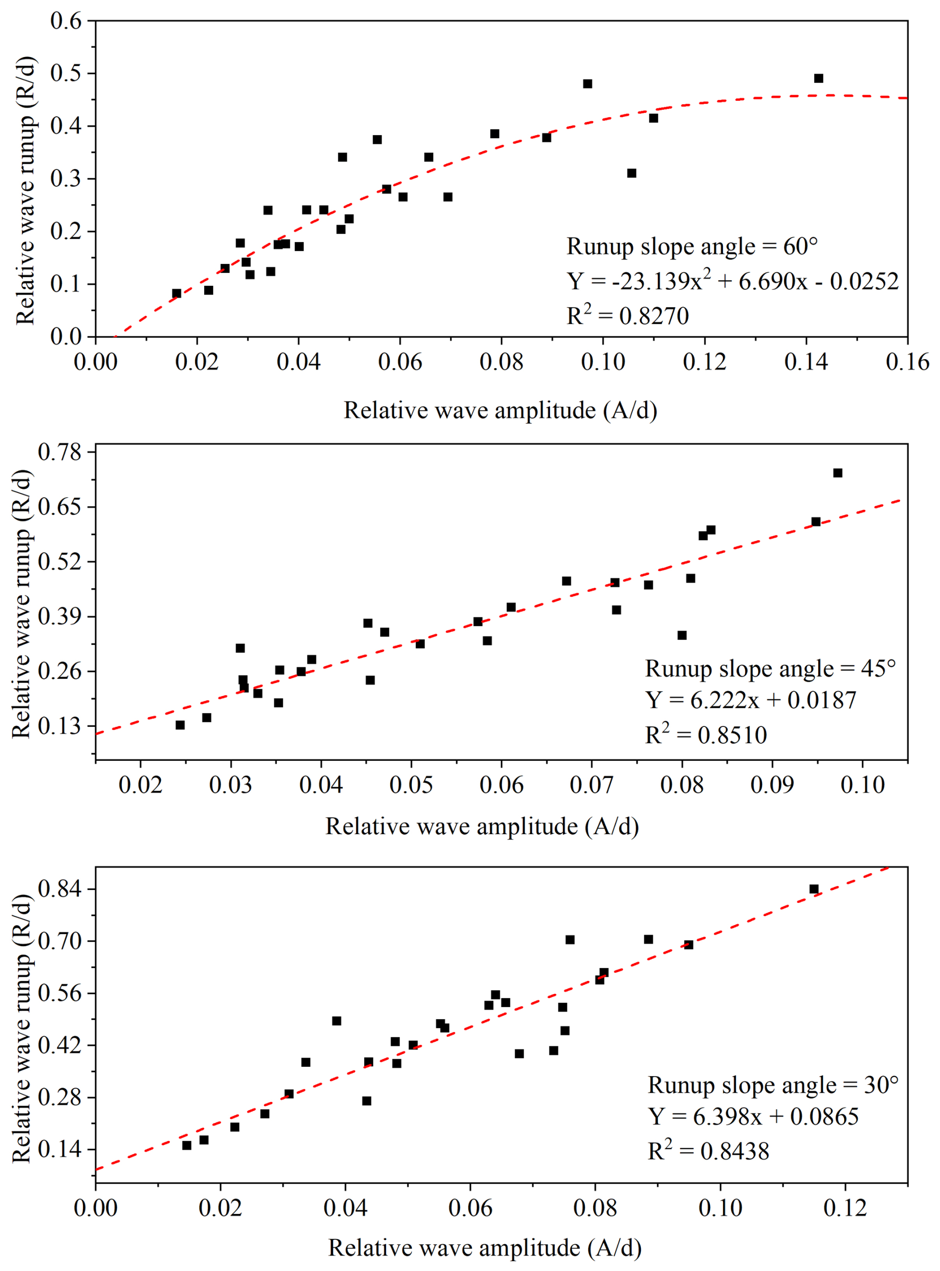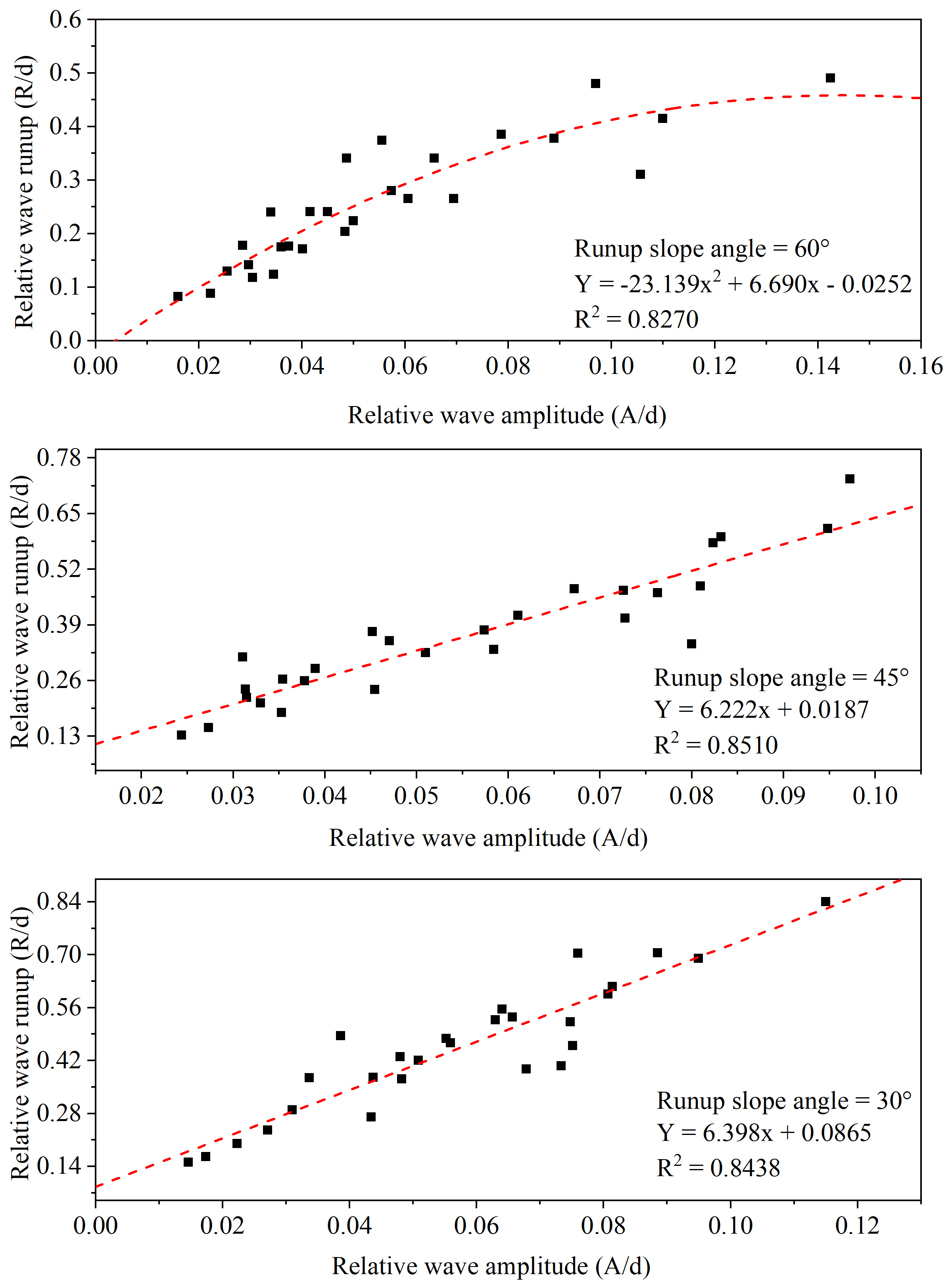 The results for the relative wave height and runup for all three water depths and three runup slope angles are shown in Fig. 7. The relationship indicates a strong correlation between wave amplitude and runup for all three slope angles. The decreasing line-slope values with increasing runup slope angle indicate that wave runup increases at a slower rate for sharp slope angles compared to mild slopes. The trend highlights the effect of slope angle on the runup. The result also indicates that the mild slope angles help wave runup amplification, as they dissipate a very small amount of energy, whereas steeper angles result in lower runup heights because of higher energy losses (Wu et al., 2018).