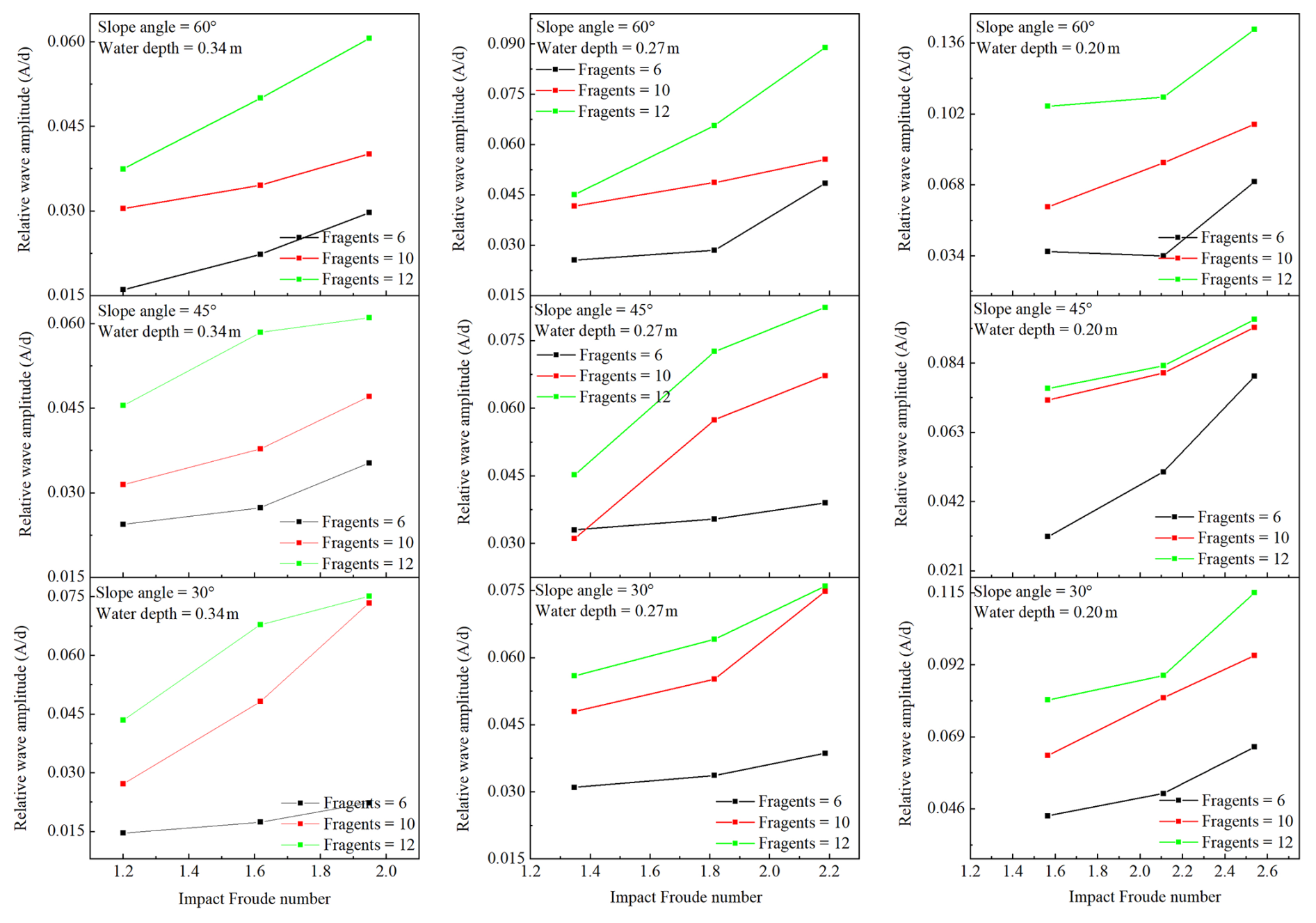 Figure 8 indicates the relationship between the impact Froude number and relative wave amplitude (), under varying experimental conditions for the first gauge, i.e., near the impact zone. Since we are interested in the immediate response of the wave influenced by the impact Froude number. The results indicate that as the water depth decreases, the relative wave amplitude and impact Froude number increase, indicating a reduction in the dissipation of impact energy, causing pronounced surface turbulence and increased wave height. Additionally, the decreased water depth also increased the value of the impact Froude number by reducing its characteristic velocity, resulting in stronger wave generation upon impact. The calculations for Reynolds number for the experiments resulted in very high values, thus indicating a strong turbulent flow, which is also evident from Fig. 5, so viscous effects are very, very small and can be ignored, thus indicating the Froude dynamics similarity. The experimental results indicate the complex interaction between wave propagation, impact dynamics, and bathymetrical effects in waves induced by rotational cliff collapse. Moreover, upon impact, the cliff fragmentation distributes impact energy over a larger area of water, thus increasing wave height by enhanced turbulence and water splashing effects.