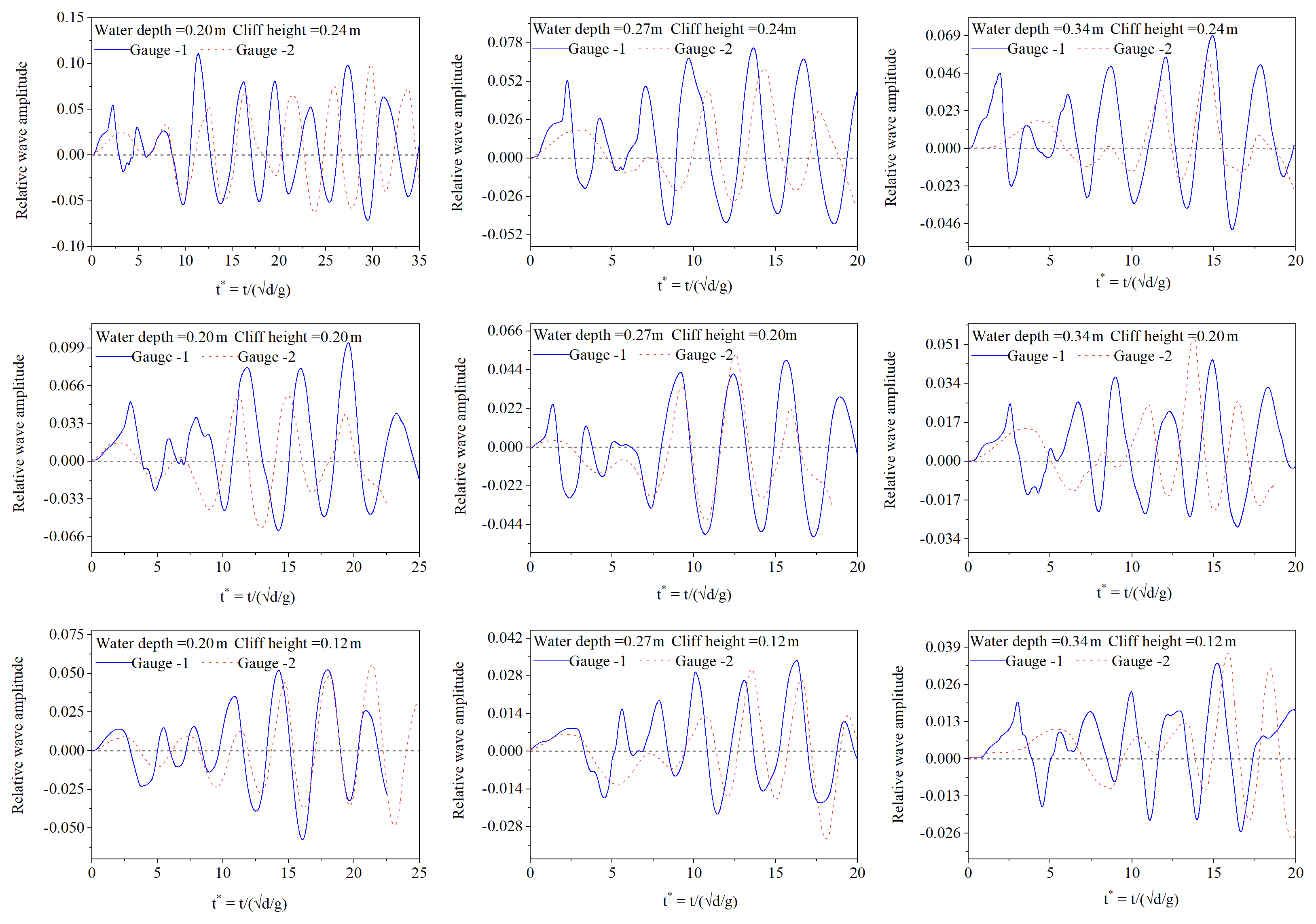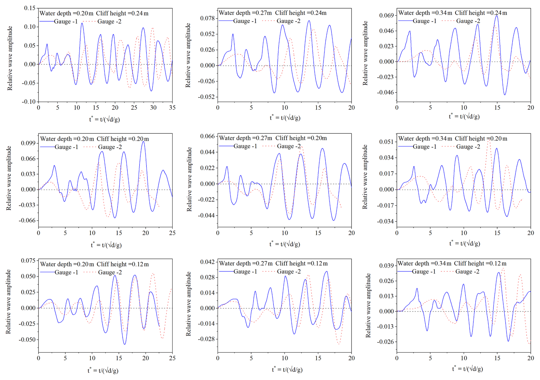 The results for the wave amplitude for various parameters are shown in Figs. 9–11. As mentioned earlier, two gauges were used to measure the induced wave amplitude. Figure 9 provides a detailed comparison of the wave amplitude recorded at both gauges for a 60° runup slope angle and a 0.445 m fall height. It can be observed that gauge-1, which is near to impact zone, has a higher relative amplitude compared to gauge-2. Furthermore, the results for the relative wave amplitude against the normalized time were also analysed for all the water depths (0.20, 0.27, and 0.34 m), fall height (0.245, 0.445, and 0.645 m), and cliff height (0.12, 0.20, and 0.24 m). The results indicate that the wave amplitude increases as the cliff height, impact velocity, and number of fragments increase for all the water depths, as can be observed in Fig. 10, thus demonstrating that the potential energy of the falling cliff plays a critical role in the magnitude of the resulting wave.