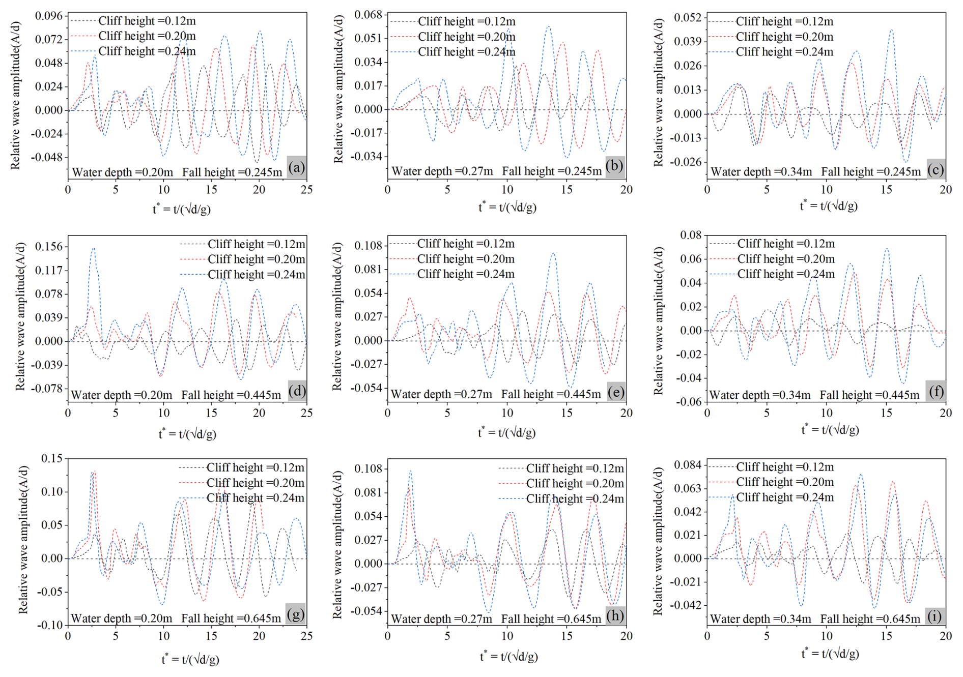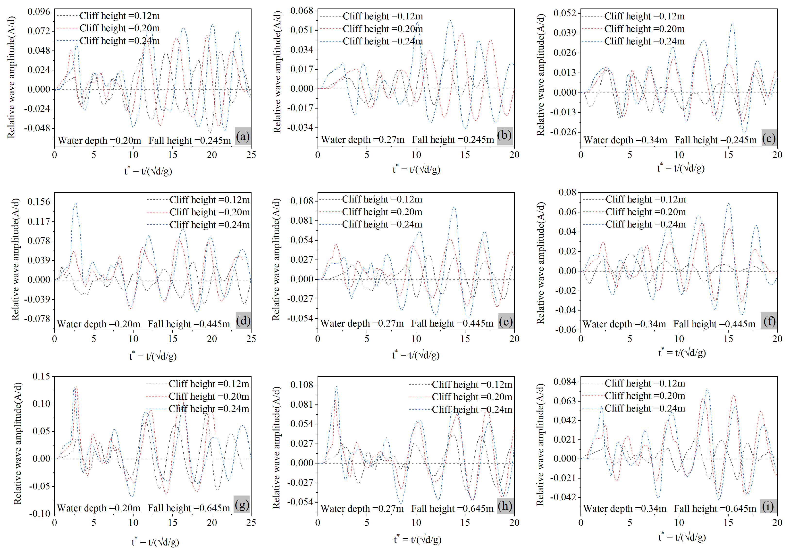 Figure 10Relative wave amplitude for various water depths, cliff height, and fall height at 30° runup slope angle, (a–c) relative wave amplitude induced by 0.245 m fall height, (d–f) relative wave amplitude induced by 0.445 m fall height, (g–i) relative wave amplitude induced by 0.645 m fall height.