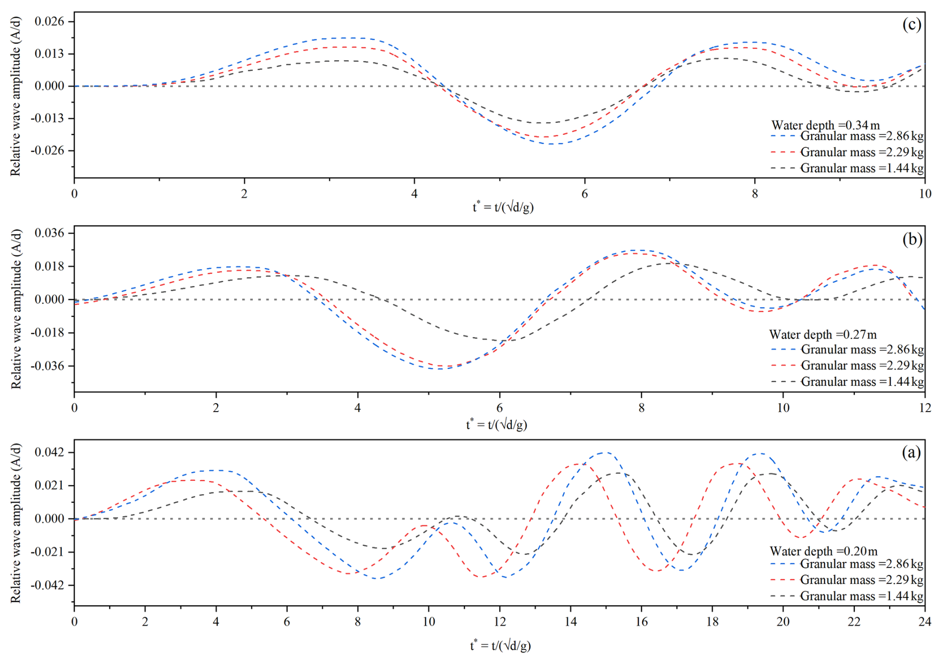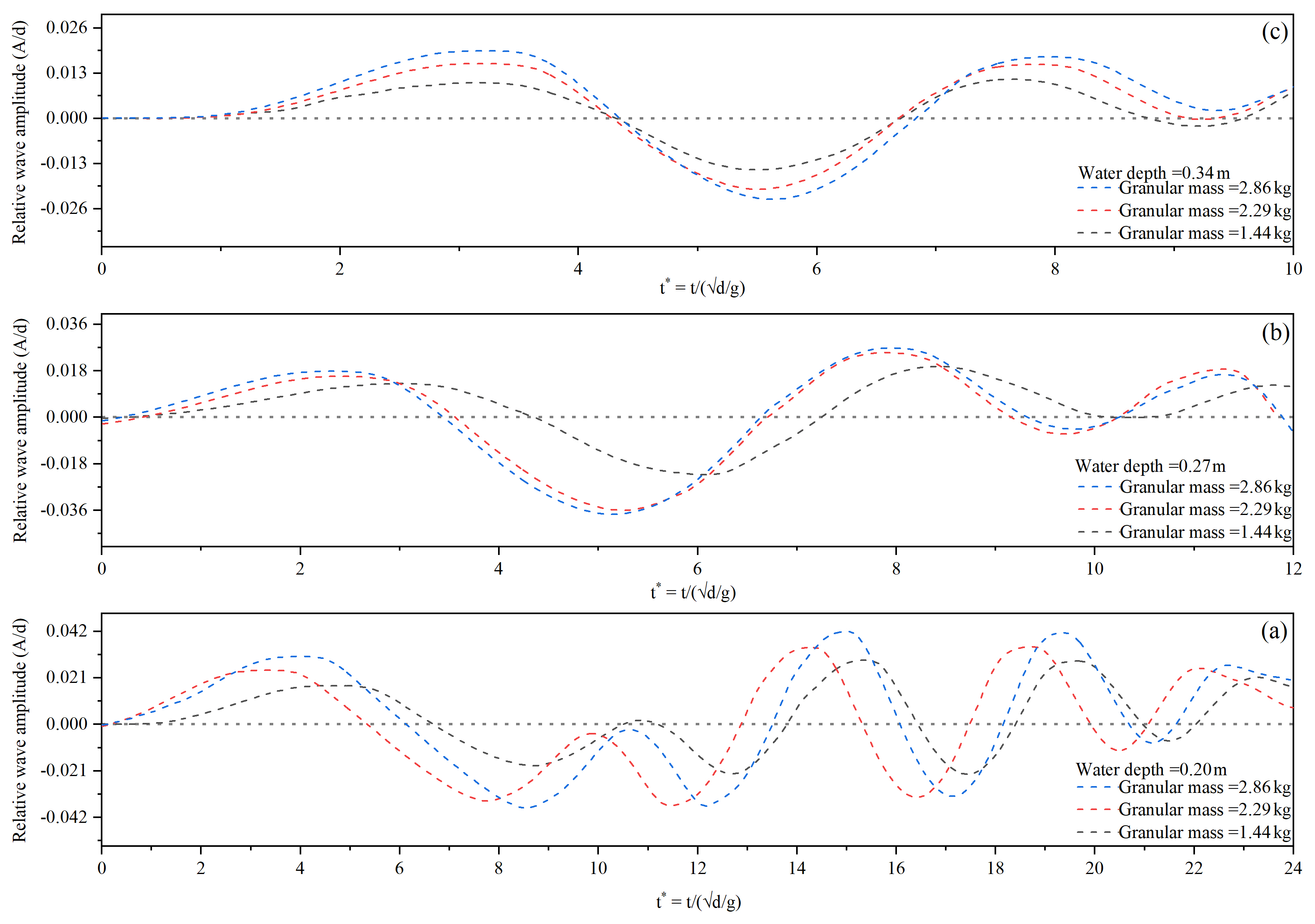 Later on, we performed another experiment by using granular material of equivalent mass as of cliff and slid it on a 30° slope, for all the water depths, and amplitude of the induced wave was measured as shown in Fig. 11. Figure 11a indicates that the wave amplitude for 0.20 m water depth and 1.445 kg granular mass (equivalent to 0.12 m cliff height) was 15 % more than 0.27 m water depth and 65 % more than wave amplitude induced by 0.34 m water depth. Whereas for 2.29 and 2.82 kg granular mass equivalent to 0.20 and 0.24 m cliff height similar trend was observed as shown in Fig. 11b and c, thus indicating that as the water depth increases, the wave amplitude decreases for all the equivalent granular masses, as happened in the case of cliff fall.