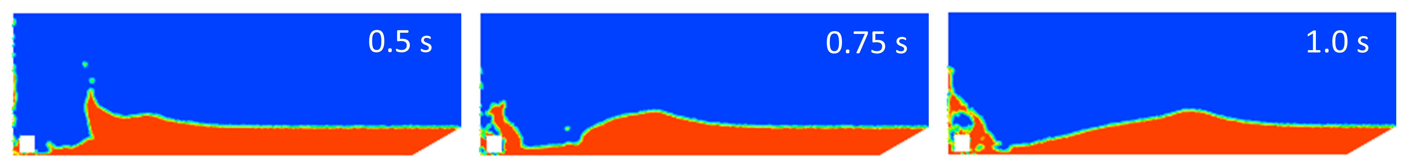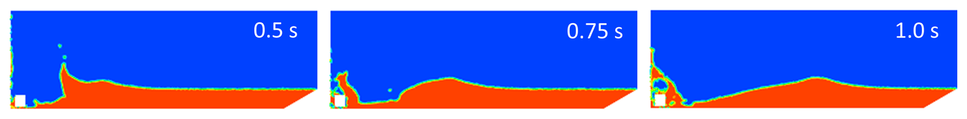 Simulating multi-phase flows is challenging due to the constant deformation of the liquid-gas interface. Various numerical methods have been developed to model these flows, each offering unique advantages depending on the specific flow regime and characteristics of interest. In this study, the Volume of Fluid (VOF) method is utilized for its effectiveness in handling significant interface distortions and topological changes. The VOF method offers superior mass conservation, which is critical in high velocity impact conditions where liquid fragmentation and wave generation are significant (Backbill et al., 1992; Hirt and Nichols, 1981). Alternative numerical schemes, such as the Front Tracking approach, are generally limited in handling complex topological changes (Tryggvason et al., 2001; Liu and Liu, 2010; Monaghan, 1994; Yang and Kong, 2018). Another approach is the Level Set method, but it suffers from mass conservation and convergence issues. The Lattice Boltzmann Method (LBM) is also common; however, its applicability to high velocity impact is rather limited (Aidun and Clausen, 2010). Given these trade-offs, the Volume of Fluid (VOF) method finds an optimal balance of computational efficiency, interface tracking capability, and proven reliability for modeling multiphase flow in the moderate-to-high velocity range relevant to this study. Therefore, a two-dimensional numerical model of a cliff, having the same properties as the experimental cliff mentioned previously, hitting the water surface is developed using the VOF method to accurately capture the liquid-gas interface.