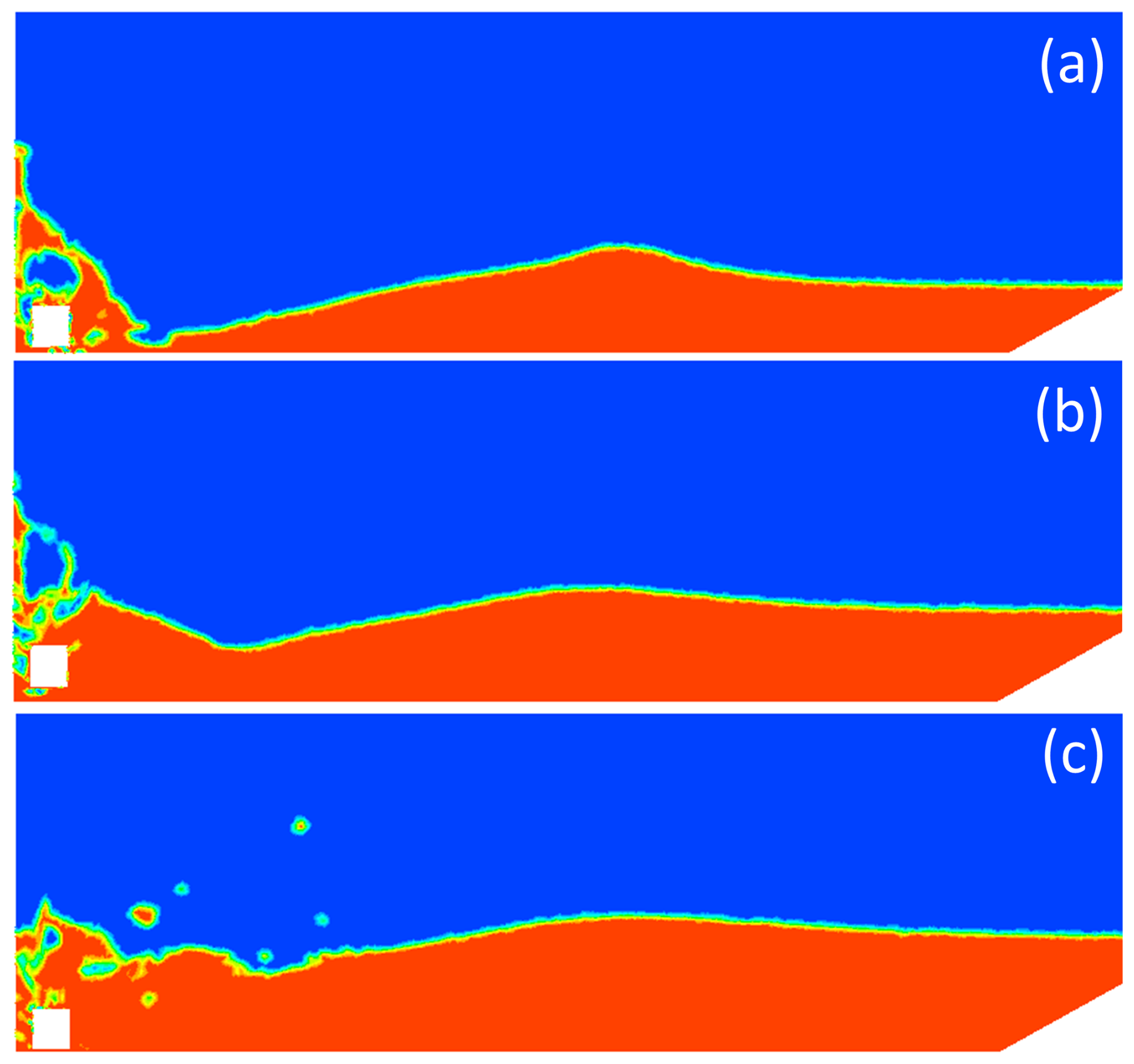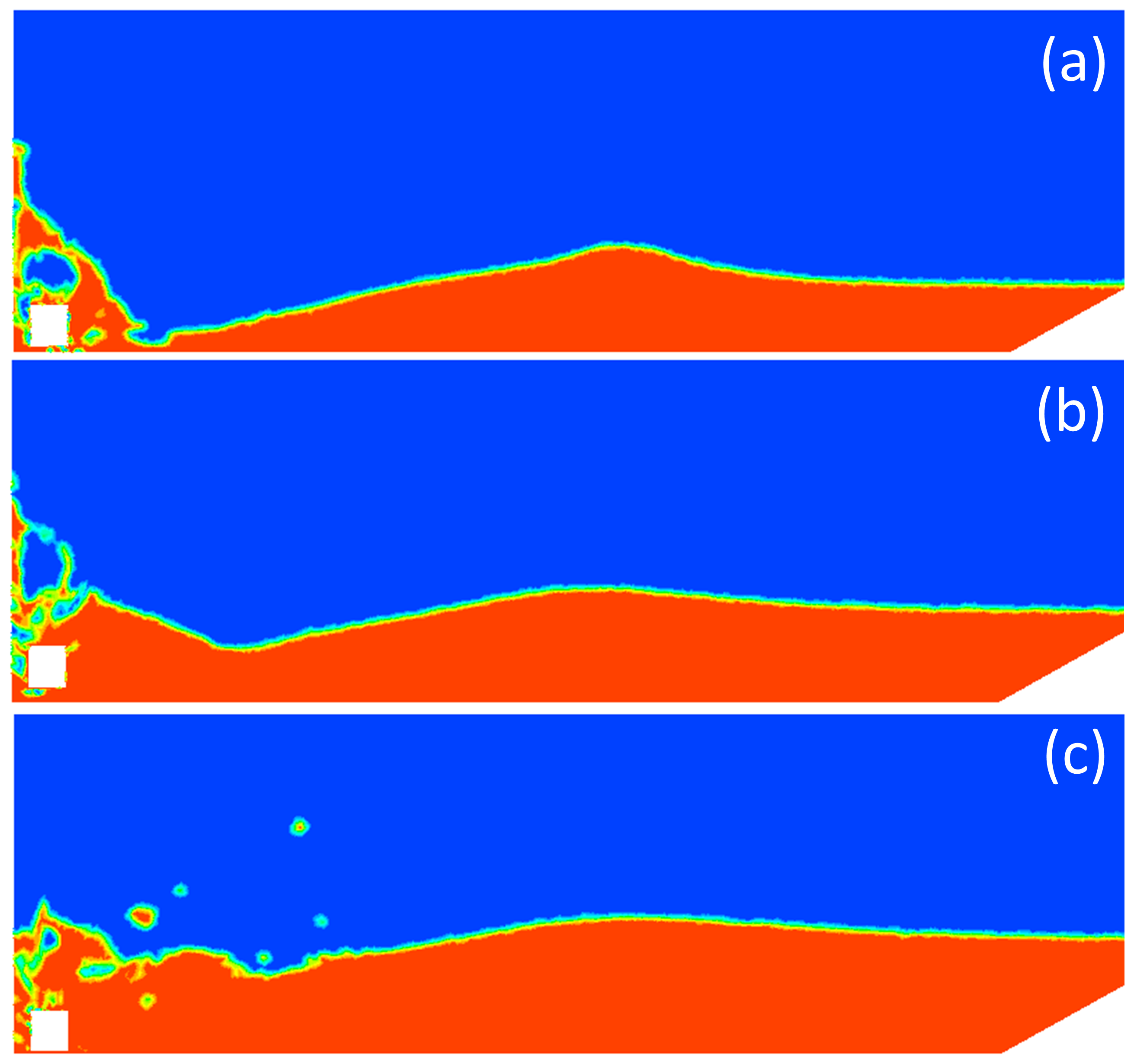 Figure 14Propagating wave fronts after the impact at time t=1 s for a slope angle of 30°. (a) d=0.2 m, (b) d=0.27 m, (c) d=0.34 m.