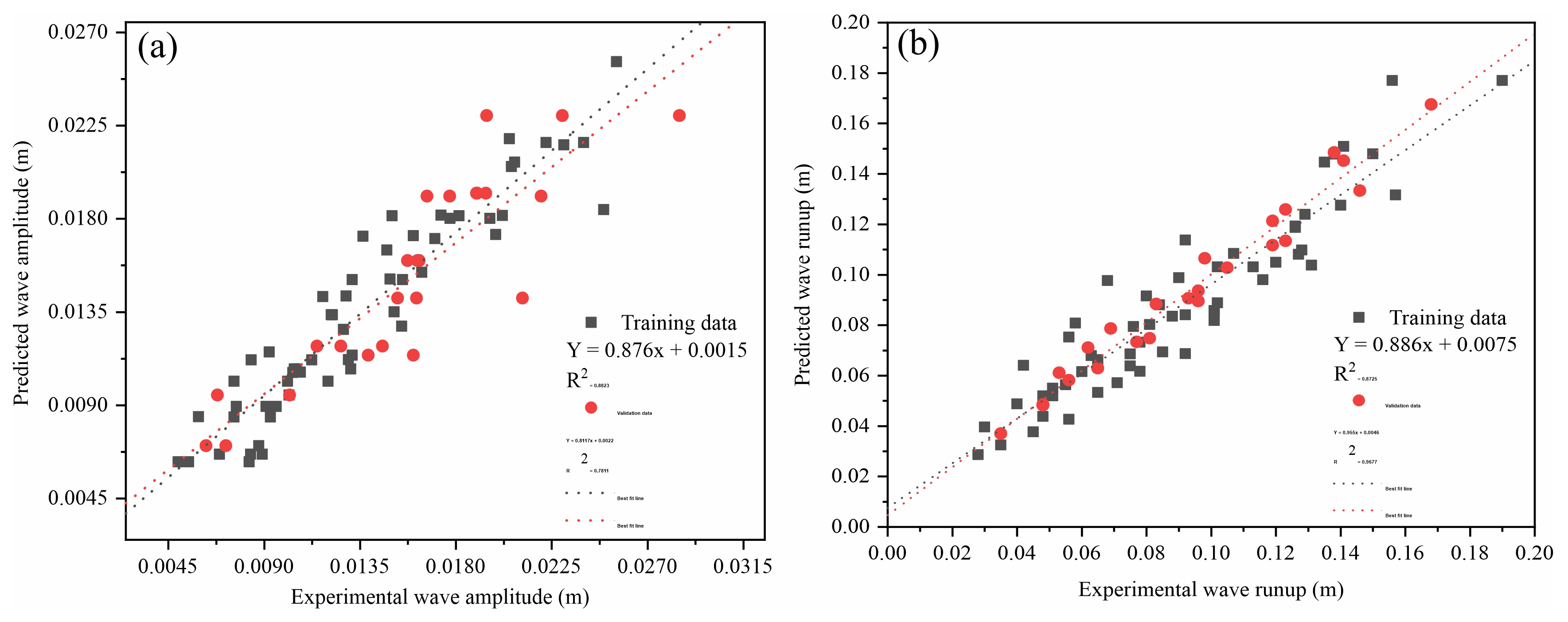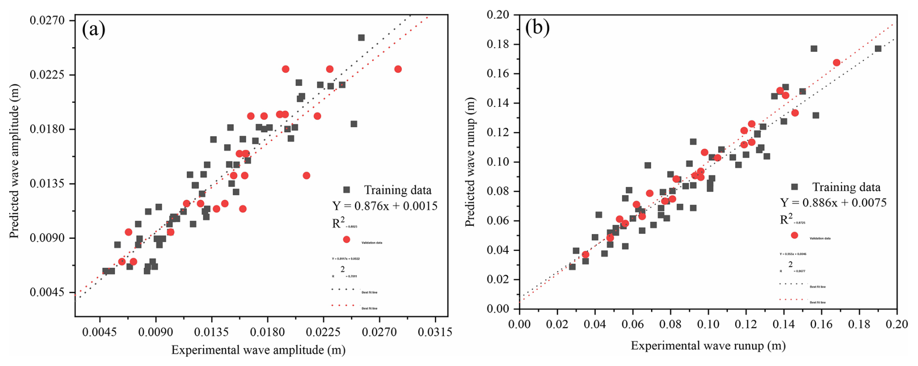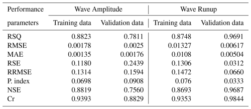 Previously, scientists have also used the slope of the regression line as a performance indicator for AI models, thus representing a correlation between experimental and predicted results. Figure 15a and b shows the regression line for our wave amplitude and runup model. For wave amplitude, the slope value for the training data set is 0.88, which is adequate, and 0.78 in validation, which is still greater than the minimum value of 0.7; it can happen as the model involving numerous parameters and complex phenomena usually performs slower for the unseen data (Yarkoni and Westfall, 2019). Whereas, for wave runup, the model performed very well for both training and validation data sets with an R2 value of 0.87 and 0.96, respectively.