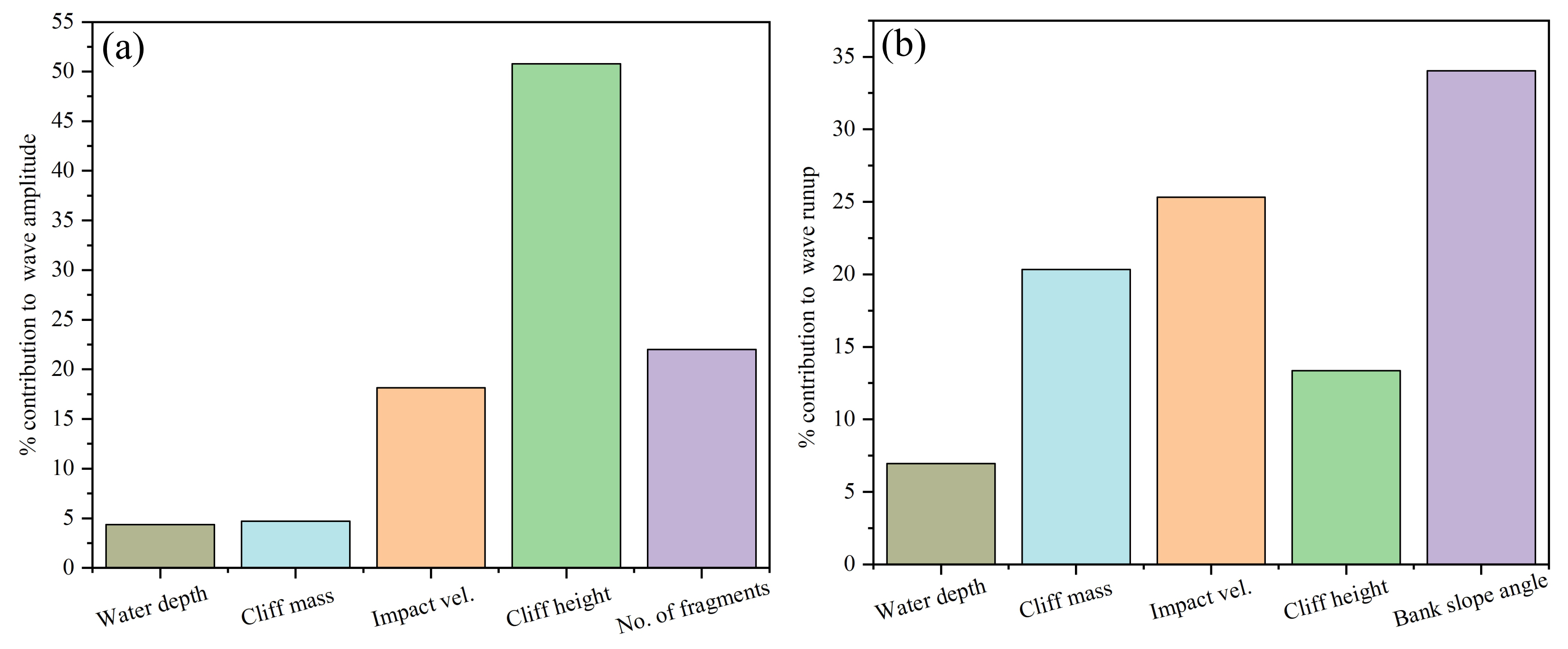 Similarly, the sensitivity analysis of wave runup (Fig. 17b) indicates that runup is greatly influenced by bank slope angle (α) and has an effect of 34 %. Impact velocity (v) contributes 25.3 %, cliff mass (m) 20.3 %, cliff height (h) 13.3 %, and water depth (d) contributes around 7 % to wave runup. Whereas, the number of fragments and fall height that have already been catered in impact velocity don't contribute to wave runup. This suggests that wave runup is primarily governed by coastal geometry, i.e., bank slope angle and cliff height, and hydrodynamic forces, i.e., impact velocity, whereas water depth contributes a little to wave runup. It can also be concluded as the effect of on the induced wave amplitude.