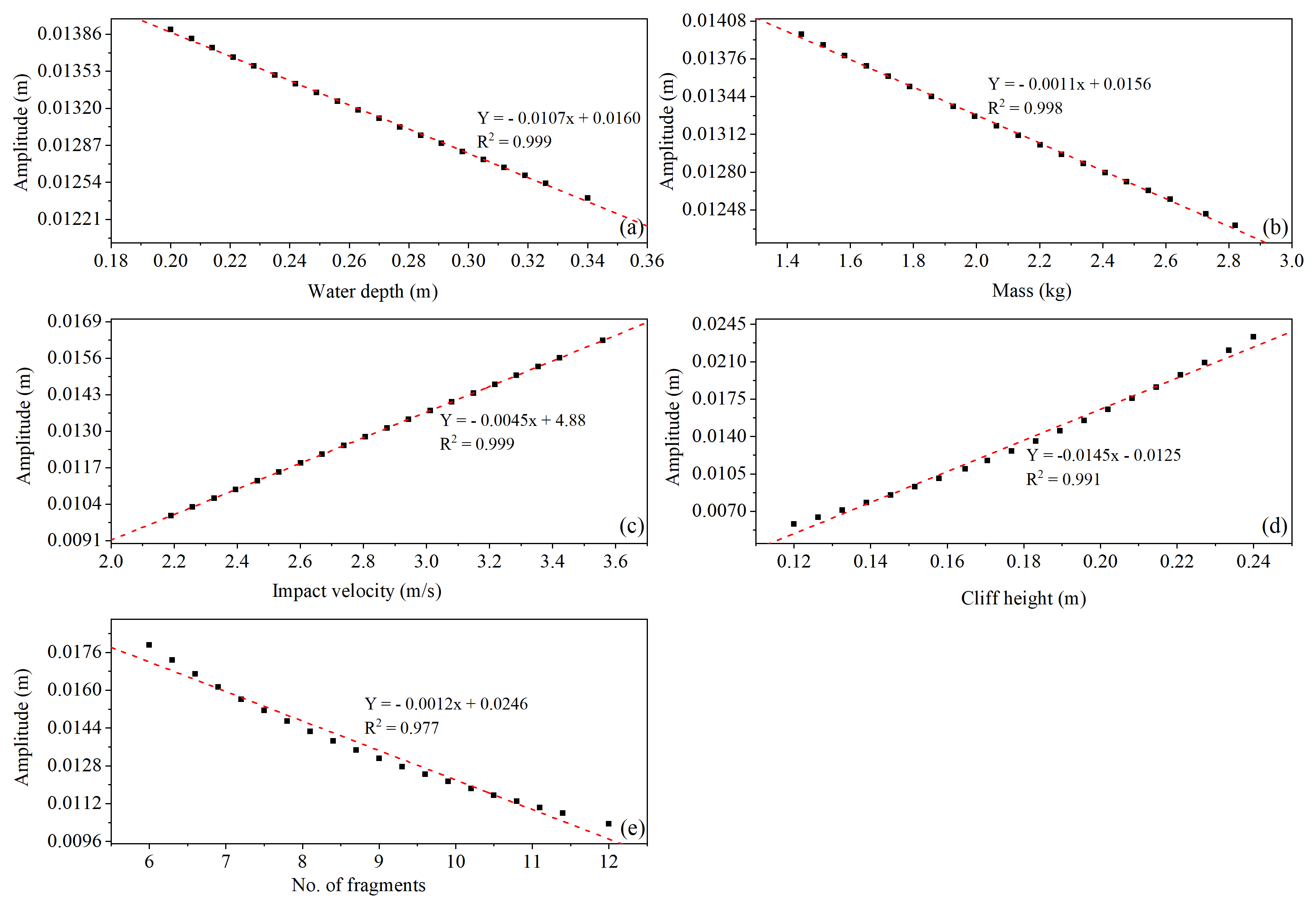 Figure 18Parametric analysis for wave amplitude (a) water depth, (b) cliff mass, (c) impact velocity, (d) cliff height, (e) number of fragments.