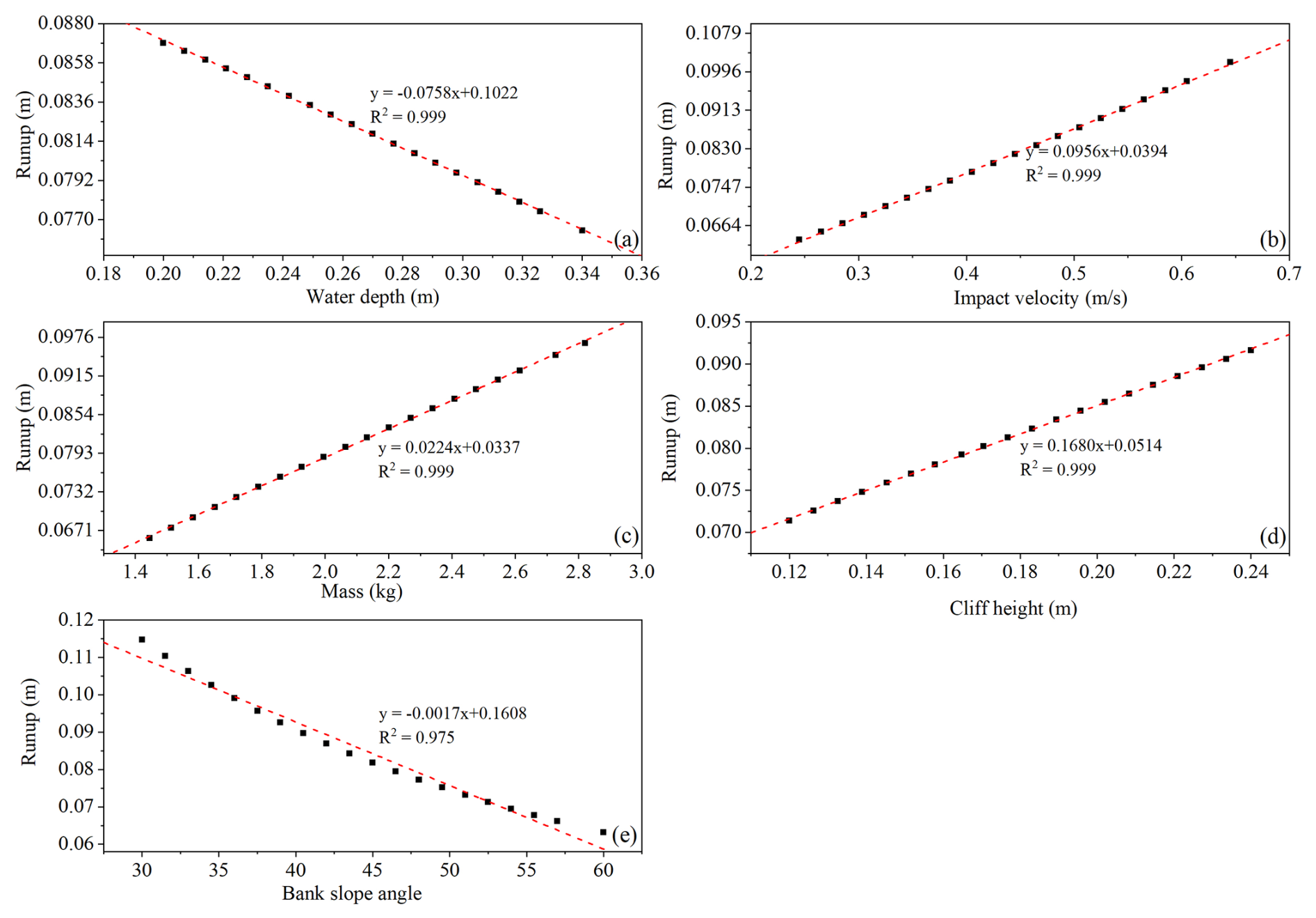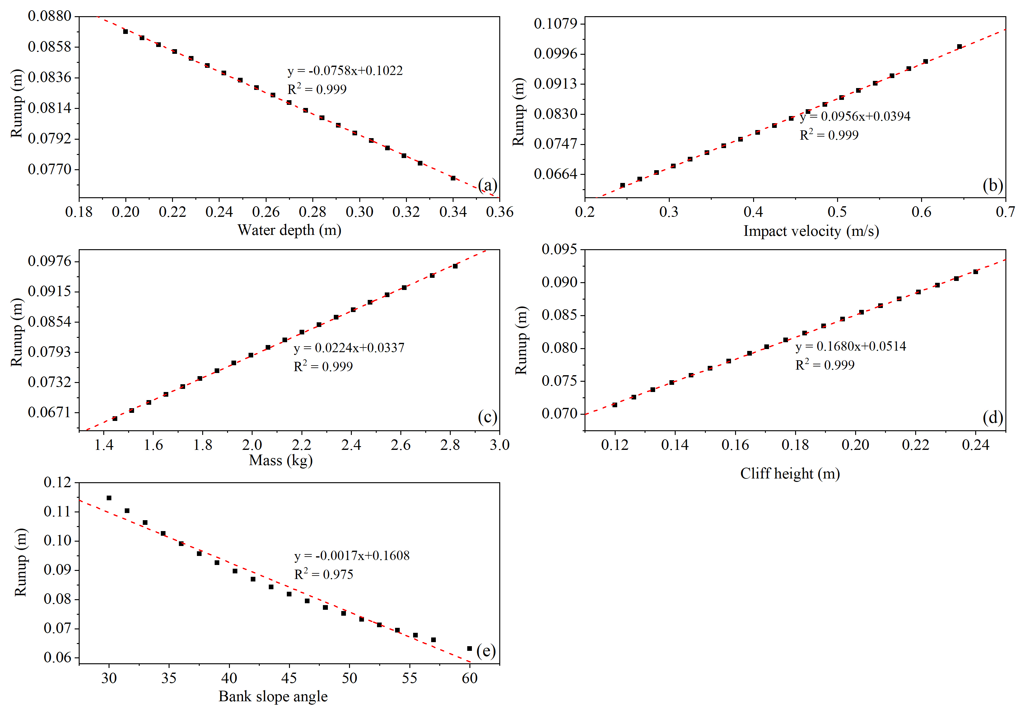Figure 19Parametric analysis for wave runup (a) water depth, (b) impact velocity, (c) mass of the cliff, (d) cliff height, (e) bank slope angle.