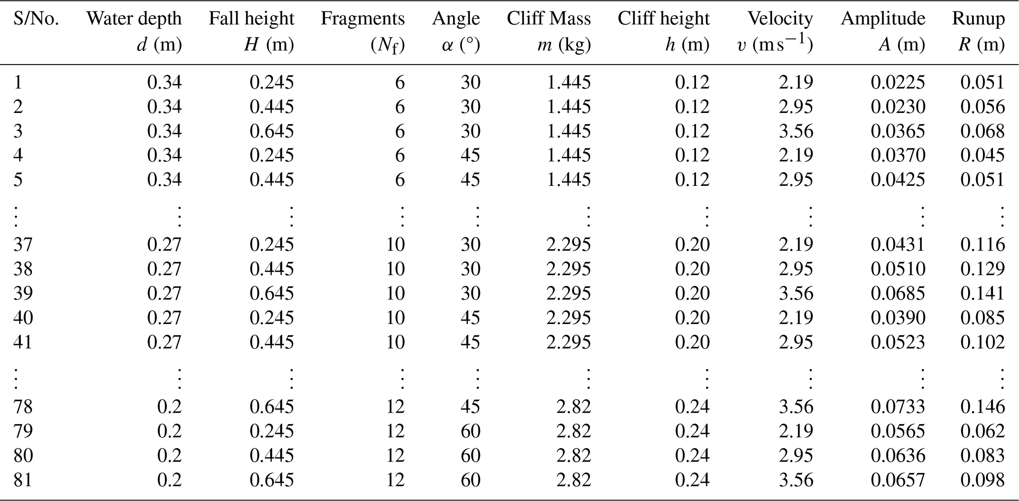 Whereas d is the water depth (m), m is the mass of the cliff (kg), v is the impact velocity (m s−1), h is the cliff height (m), α is the runup slope angle, and Nf is the number of fragments.
