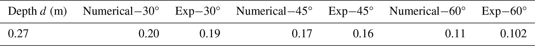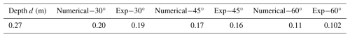 To validate the results of simulations, we compared the results of the runup height with the experimental values. Table 3 presents the runup values for various runup slope angles, i.e., 30, 45, and 60°, for a water depth of 0.27 m. The comparison of simulated values was performed at this depth, as it lies in the middle of the experimental test range of water depths. Numerical modeling results indicate that for a fixed water depth, the runup values consistently decrease as the runup slope angle increases from 30–60°. At a water depth of 0.27 m, the runup decreases from 0.2 m at 30–0.17 m at 45°, and further to 0.11 m at 60°. This reduction is attributed to the changing momentum transfer dynamics with increasing slope angle. At less steep angles (closer to horizontal, e.g., 30°), the rock's momentum generates a stronger radial splash and greater upslope displacement of the liquid along the cliff. As the angle increases toward 60°, a larger component of the momentum is directed parallel to the cliff, reducing the vertical impulse. The experimental and numerical results agree well, and the difference lies within the acceptable range of 4 %–5 %. The experimental results for the other two water depths also indicate similar behavior.