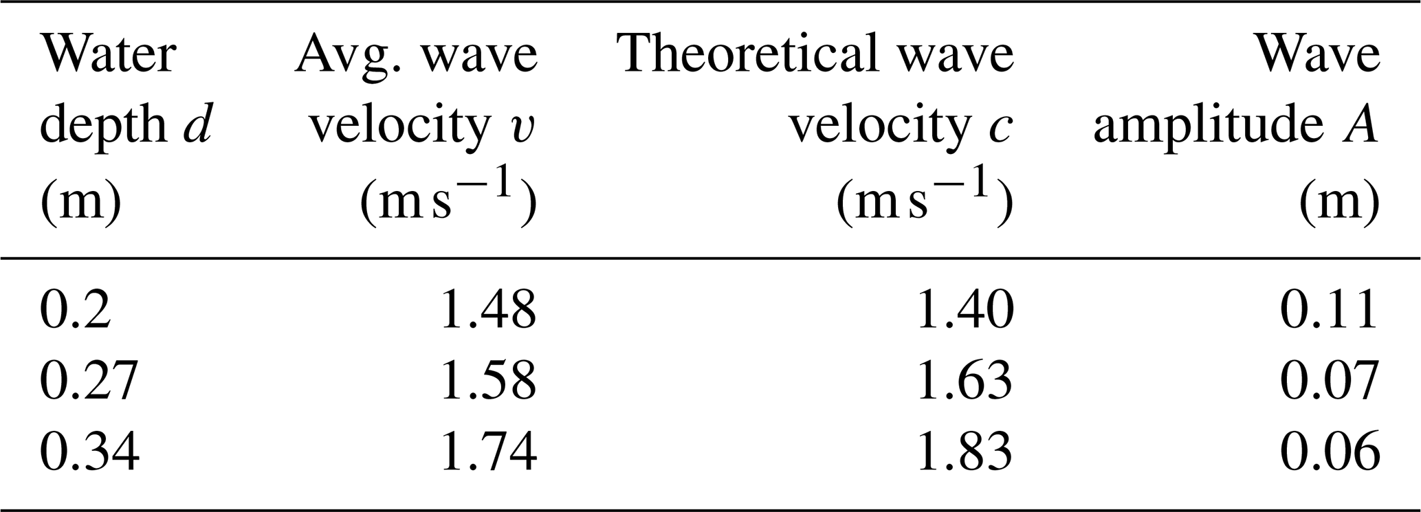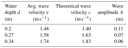 The observed depth dependence can be rationalized through fundamental principles of wave propagation in gravity-dominated, multi-phase flows. In the shallow water regime, given that the pool depths (0.2–0.34 m) are comparable to or smaller than the wavelengths of the generated waves, the phase velocity c of long gravity waves approximates , where g is the gravitational acceleration (9.81 m s−2), and h is the undisturbed water depth. This relation arises from the shallow water equations, where hydrostatic pressure balance and negligible vertical acceleration dominate, leading to a dispersionless incident wave speed that scales with the square root of depth. Substituting the water depths yields theoretical velocities of approximately 1.40 m s−1 for d=0.2 m, 1.63 m s−1 for d=0.27 m, and 1.83 m s−1 for d=0.34 m, which align closely with the simulated values (discrepancies of 7 %–10 % may stem from viscous dissipation, non-hydrostatic effects near the impact zone, or spreading of the wave front). A comparative analysis of the results is shown in Table 4.