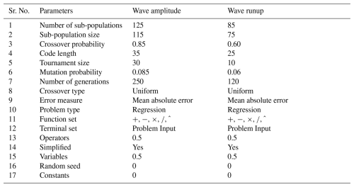 The relation among the parameters was evaluated using Pearson's correlation to analyze the multicollinearity and interdependency between the parameters, as they can obscure the interpretation of the developed model. The model was developed by splitting the data into two subsets, i.e., training (70 %) and testing (30 %). The randomization was done by MEP itself. Following the criteria, 70 % of the data, i.e., 57 data points, were taken as training data, whereas 30 % of the data, i.e., 24 data points, were considered for validation of the model. The mathematical expression for MEP is obtained by solving the C++ code and representing it as per optimized hyperparameter settings, as shown in Table 5. The prediction model for wave amplitude and runup was developed by analyzing the MEP code in MATLAB, as shown in Eqs. (4) and (5).