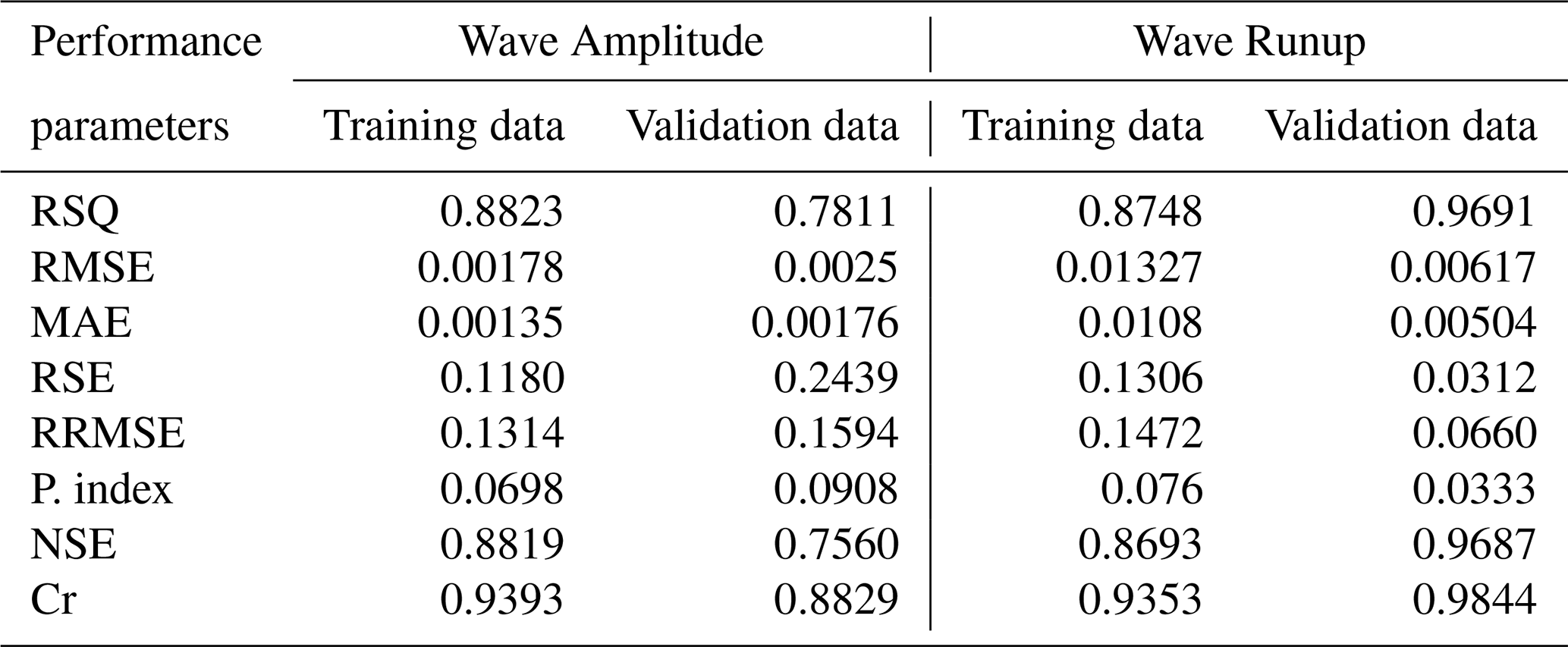 Whereas, and are the average values of the experimental and predicted results, and ei and pi are ith values of the modeled and predicted results, for n total samples. It is good to consider the error indices while analyzing the predictive capability of complex models. The wave runup model demonstrated a robust performance for both training and testing datasets. The lower values of RMSE and MAE indicate little deviation from experimental values, while RSE and RMSE values confirm lower normalized error, as shown in Table 6. The higher values of NSE and Cr further validated the model reliability for the training phase. Whereas for the validation dataset, i.e., the unseen data model displays even stronger performance with lower RMSE and MAE values compared to the training dataset. Moreover, higher Cr and lower performance index values highlight enhanced model efficiency. This suggests that the model works well for unseen data, making it suitable for predicting the wave runup induced by rotational cliff collapse (Gardezi et al., 2024).