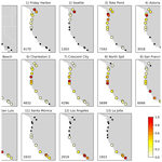 Moving from assessing compound flooding potentials at individual locations, we then assess the likelihood of simultaneous compound flooding arising across different locations. Figure 7 maps the relative occurrence rate of potential compound flood events at individual locations on the West coast of the United States, given the location of interest is experiencing an event with compound flooding potential. Here potential compound flood events are defined as events with both total water level and river discharge exceeding the 99th percentile. Results show that for the west coast, when a given location sees potential compound flooding, other locations are likely to experience potential compound flooding simultaneously. As one may expect, the relative occurrence rate shows asymptotic patterns across space: These rates are relatively high at locations near the primary location and start to decrease when the distance increases. For example, when a potential compound flood event occurs in Seattle, the chance that Friday Harbor is also affected is relatively high (0.54) while the joint rates for other locations are much lower (e.g. Toke Point: 0.39, Astoria: 0.27, Charleston: 0.16). At most locations, a relatively high joint occurrence rate (> 0.5) can be observed at one or two nearby locations. However, there are a few locations where three nearby locations show a high relative occurrence rate; this is case for Astoria, Crescent City, and Los Angeles.