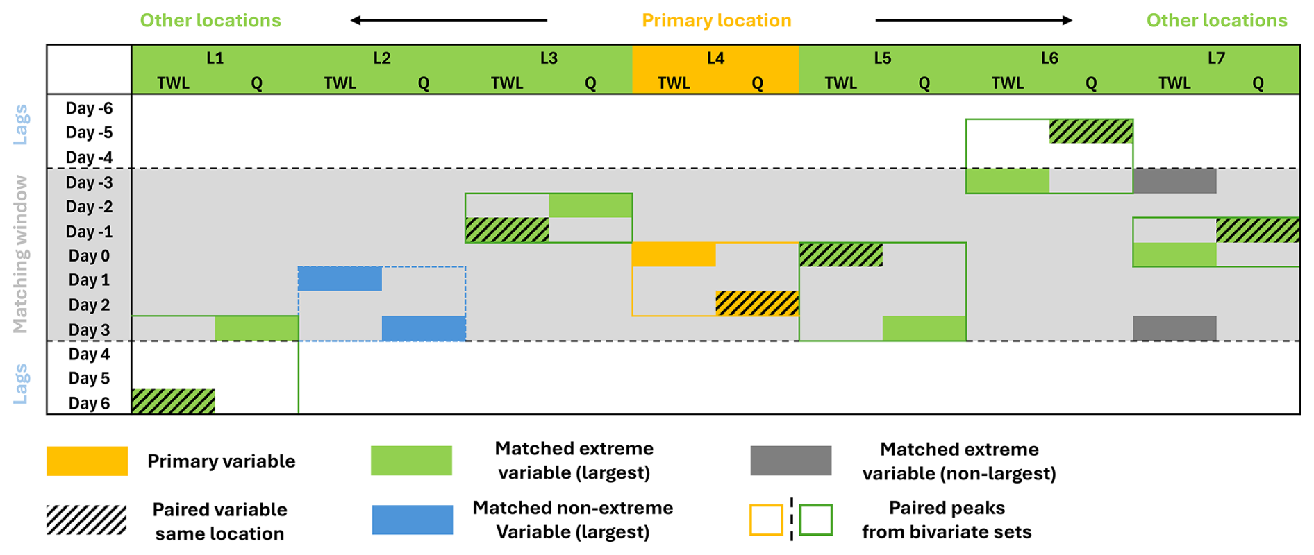 Figure 2Schematic of the construction of one spatially joint events across the 7 locations of an exemplary coastal region. SWL refers to total water level while Q refers to river discharge. The orange cell indicates the primary variable with the largest marginal value at the primary location. For other locations, matched extreme variables are marked in green where the maximum of either TWL or Q within the matching window is selected. Dark grey cells are the available extremes within the window but they are not the largest. Hatched cells are the paired peaks to the matched variable from the bivariate events identified for individual locations. Blue cells indicate the matched non-extreme variables; they are not from paired bivariate peaks and are marked by a blue dashed box.