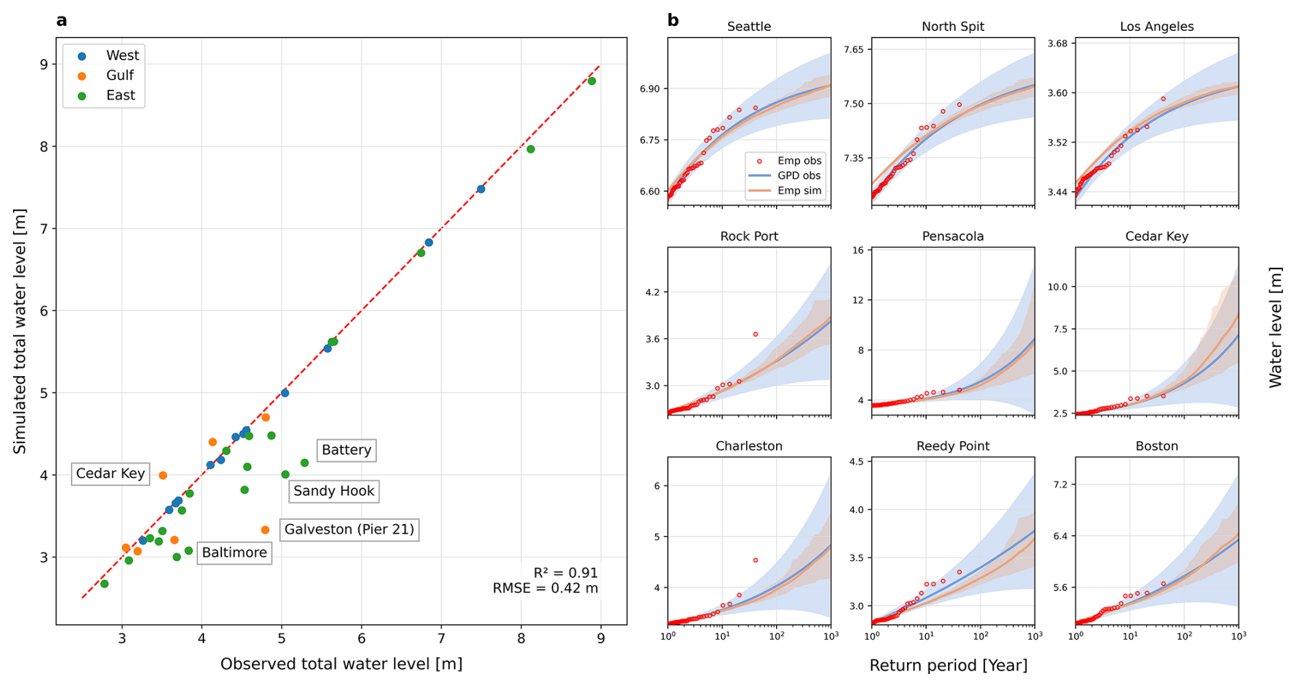 Figure 3Validation of the generated synthetic coastal water levels. (a) Maximum observed versus simulated peak total water levels over a 41 year period at tidal gauges on the West coast (blue), Gulf of Mexico (orange), and East coast (green). The maximum observed peaks are extracted from the 41 year observations, while the simulated peaks refer to the median of total water levels from 250 random model samples of 41 years length. The red dashed line represents the identity (1:1) line. (b) Comparison between observed and simulated water level return periods for nine selected gauges (three per coast; see the locations in Fig. 1). Red dots are the empirical return periods from observed peak water levels, while blue curves represent the return periods from the GPD fit to the observations. Orange curves refer to the empirical estimates from the 10 000 year simulation. Shaded areas are the confidence intervals corresponding to the 5th and 95th percentiles.