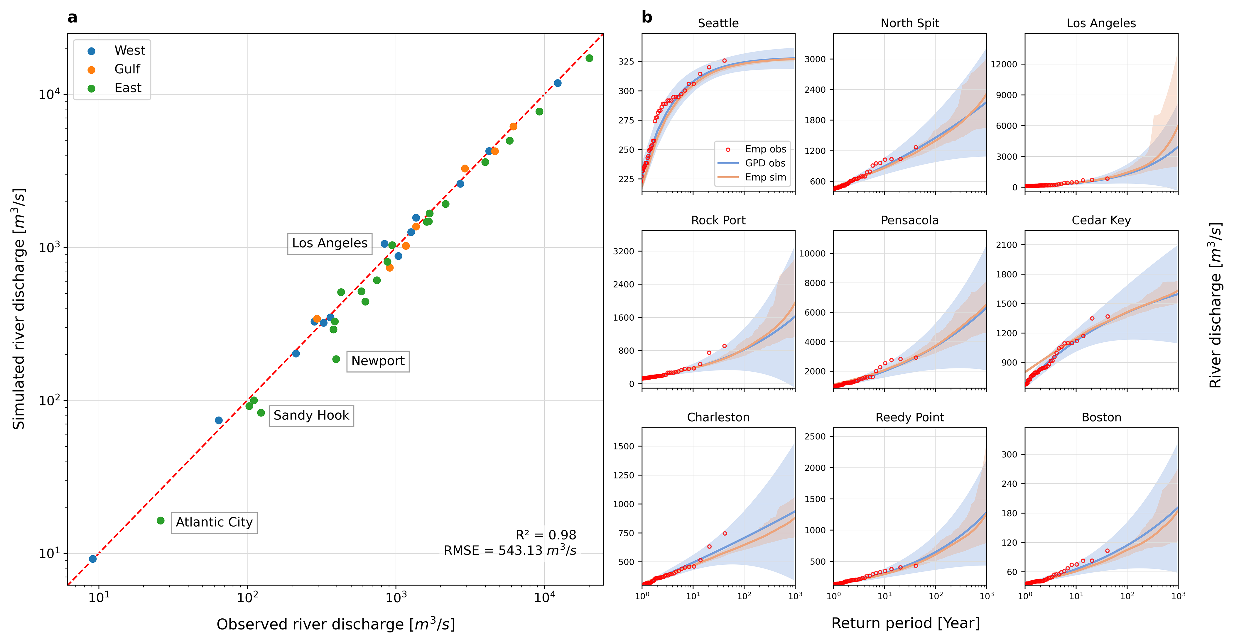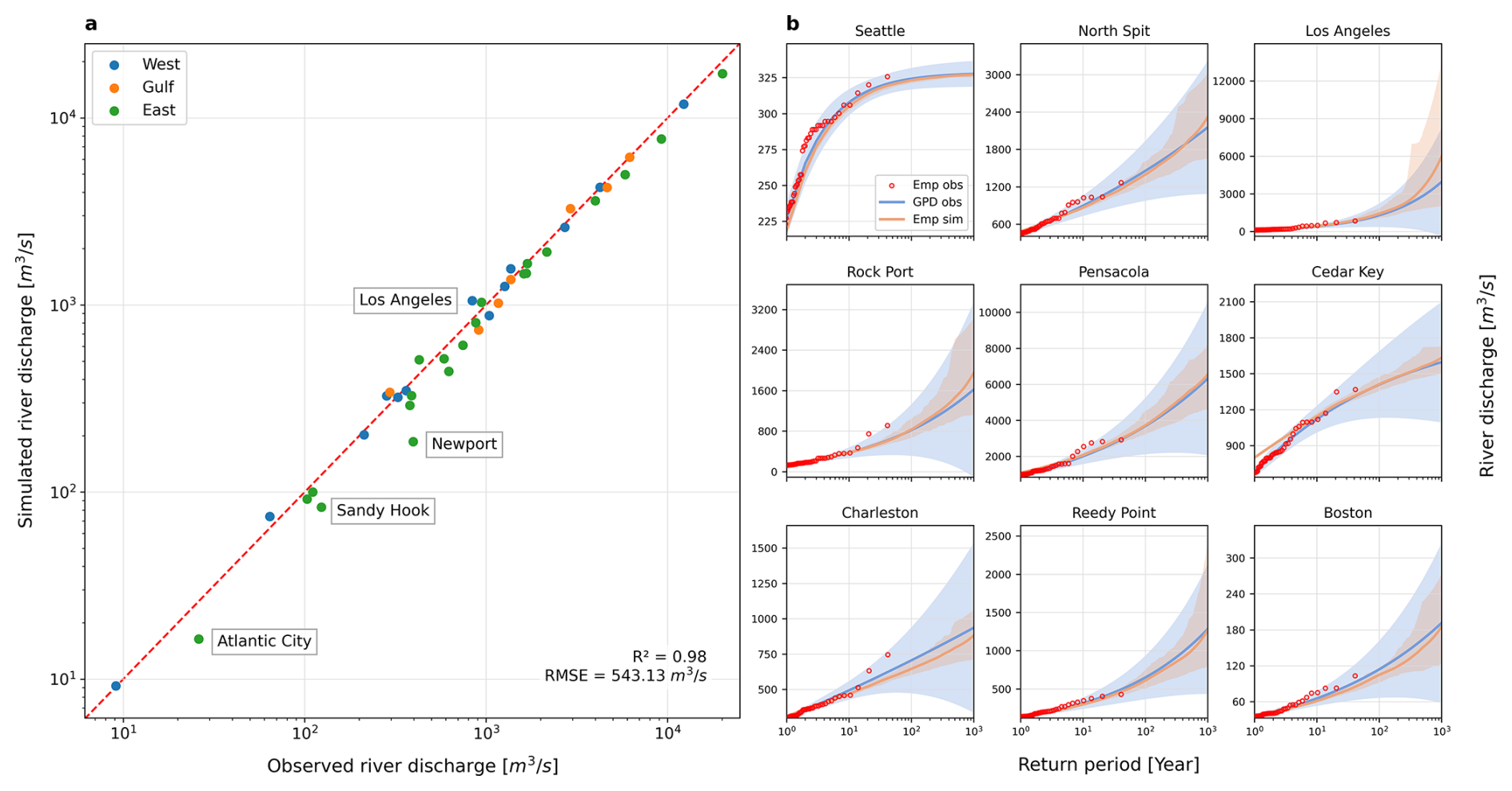 Figure 4Validation of the generated synthetic river discharges. (a) Maximum observed versus simulated peak river discharges over a 41 year period at paired river stations on the West coast (blue), Gulf of Mexico (orange), and East coast (green). The maximum observed peaks are extracted from the 41 year observations, while the simulated peaks refer to the median of river discharges from 250 random model samples of 41 years length. The red dashed line represents the identity (1:1) line. (b) Comparison between observed and simulated water level return periods for the nine stations (paired with the nine coastal gauges; see the locations in Fig. 1). Red dots are the empirical return periods from observed peak water levels, while blue curves represent the return periods from the fitted GPD using these observations. Orange curves refer to the empirical estimates from the 10 000 year simulation. Shaded areas are the confidence intervals corresponding to the 5th and 95th percentiles.