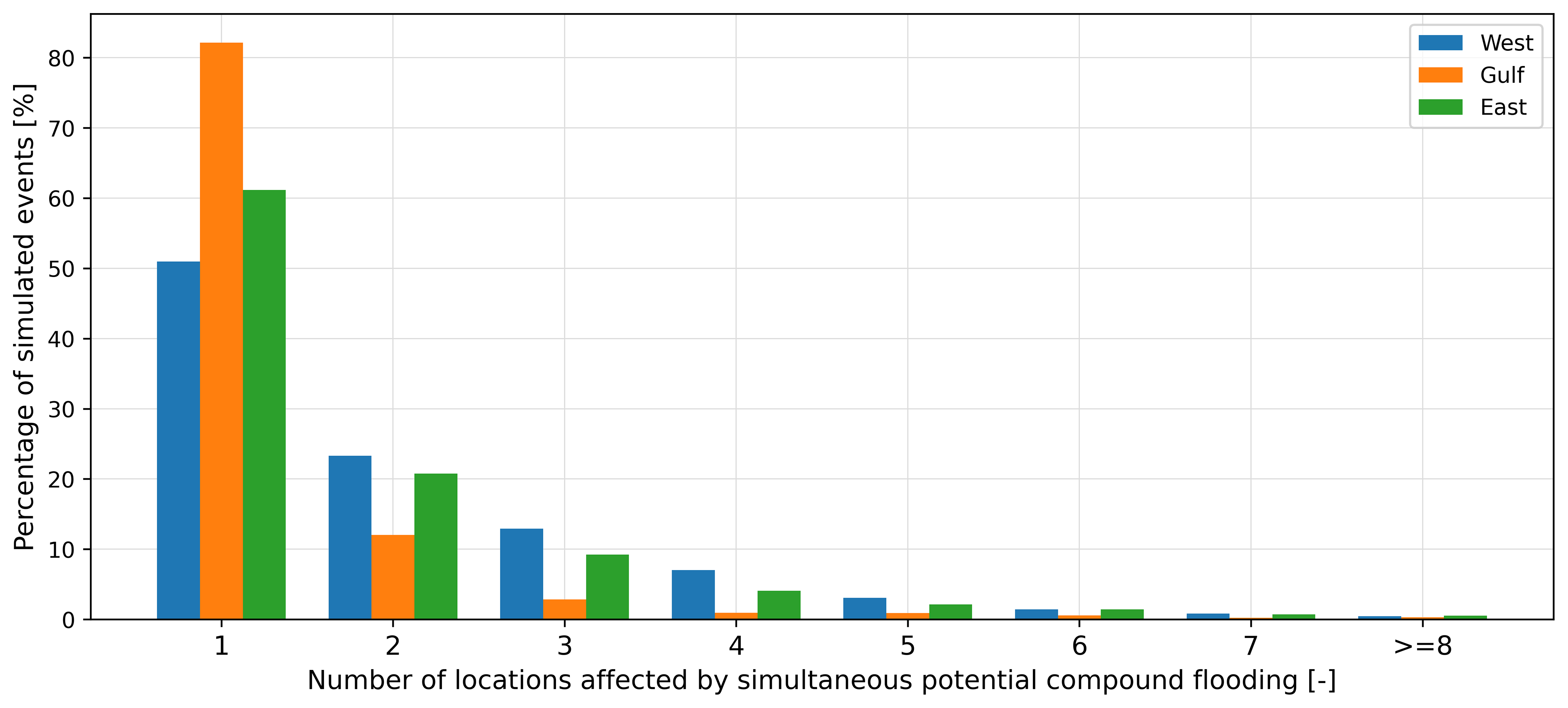 Figure 5 shows the percentage of simulated events that may potentially cause compound flooding, categorised by the number of affected locations for the US coastal regions. These events are those with both total water level and river discharge exceeding the respective 99th percentiles. Our analysis reveals that the Gulf coast shows the highest frequency of localised compound flood events among the three US coasts, with over 82 % of all potential events affecting only a single location. Nevertheless, it is still likely (around 12 %) that potential compound flood events may affect two locations on the Gulf coast, while events that may affect more locations become increasingly rare (e.g. less than 3 % for three locations and 3 % for more than three locations). In contrast, the west coast shows higher frequencies of widespread potential compound flooding. For example, about 50 % of the events may result in potential compound flooding at one location while the chances of affecting multiple locations are 23 % for two locations, 13 % for three locations, 7 % for four locations, and 3 % for five locations. The east coast shows slightly lower frequencies of potential compound flooding events affecting multiple locations. The frequency of events affecting a single location is 61 %, followed by 21 %, 9 %, and 4 % for two, three, and four locations, respectively.