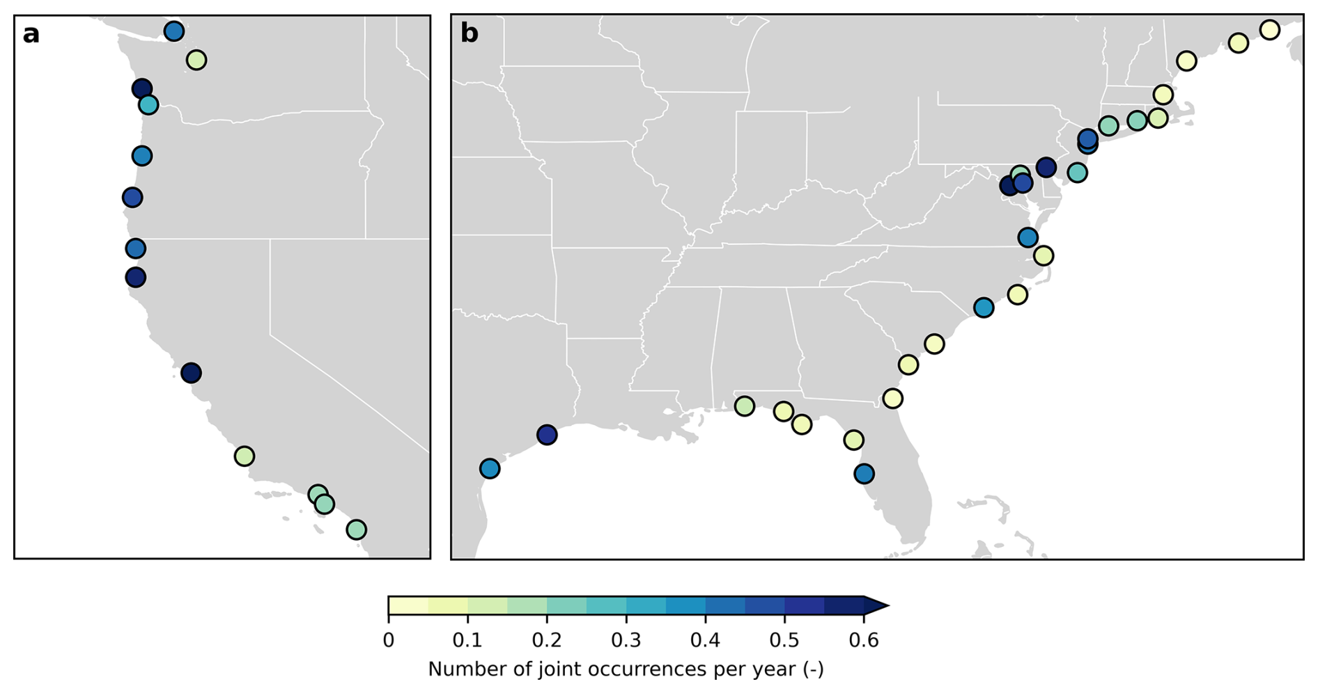Figure 6Number of joint occurrences per year between extreme total water levels and river discharges from simulated 10 000 year event sets for (a) the West coast and (b) the combined Gulf of Mexico and East Coast. Joint occurrences are defined for events where both water level and river discharge are above the 99th percentile threshold. The state borders are marked in white.