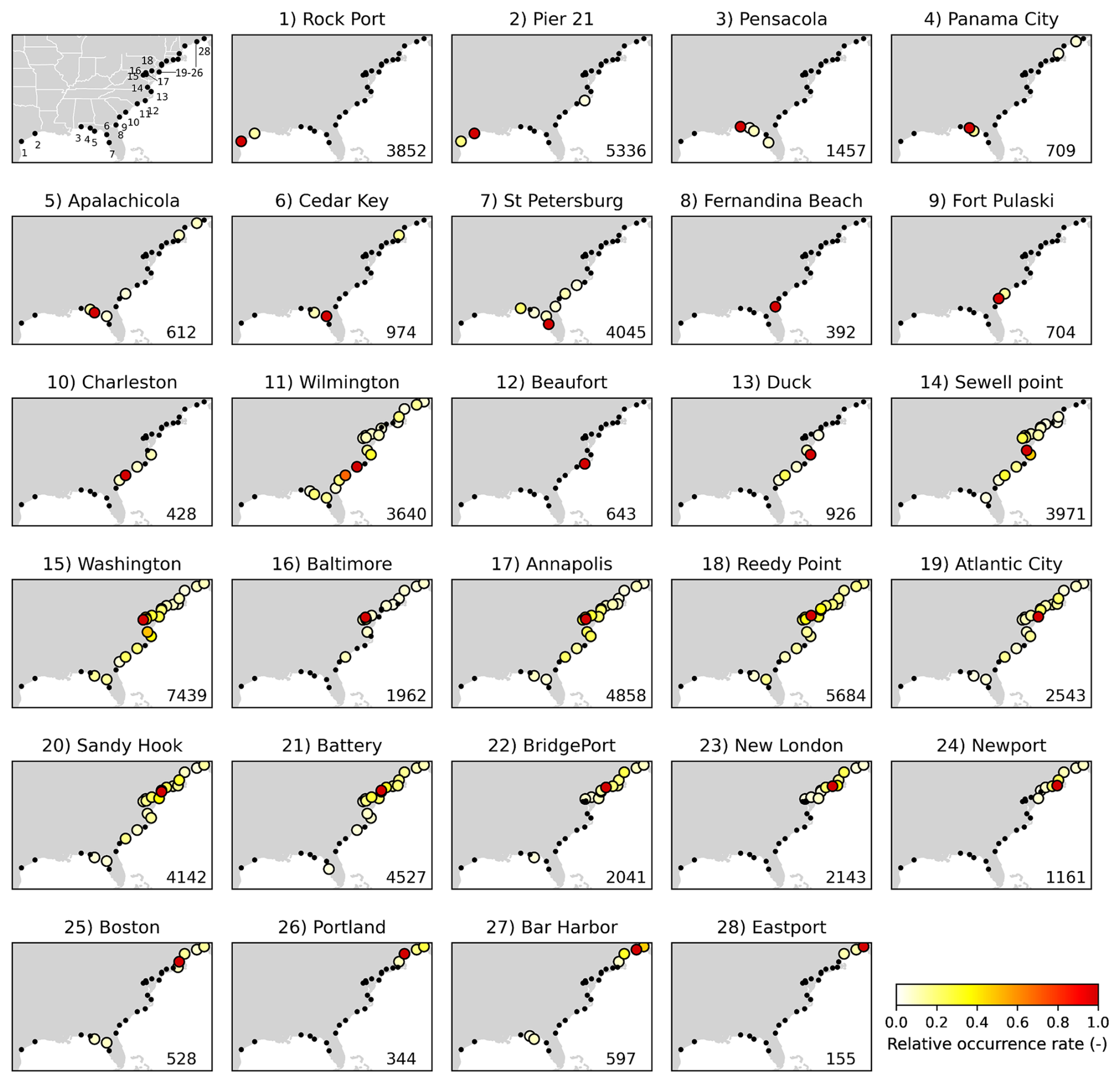 Figure 8Relative occurrence rate of potential compound flooding at remaining locations given potential compound flooding occurs at a primary location for the combined Gulf of Mexico and East Coast. The top-left panel shows the individual locations and the state borders are marked in white. Potential compound flooding is defined by events with both total water levels and river discharges exceeding the 99th percentile. Small black solid circles refer to the joint occurrence rate lower than 0.05, and the number on the lower left corner of each subplot represents the total number of stochastic events with compound flooding potential at the primary location from the 10 000 year simulated event set.