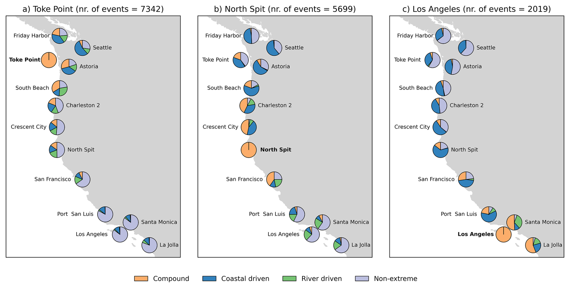 Figure 9Relative frequency of different types of events given potential compound flooding occurs at a primary location for (a) Toke Point, (b) North Spit, and (c) Los Angeles on the US West Coast. Potential compound flood event (orange) is defined for events with both total water levels and river discharges exceeding the 99th percentile. The total number of simulated compound events at the primary location is indicated in the title of each panel. Blue refers to coastal driven events where only the total water level exceeds the 99th threshold, while green refers to river driven events where only the river discharge exceeds the 99th threshold. Purple refers to non-extreme events where neither of the drivers exceeds the threshold.