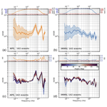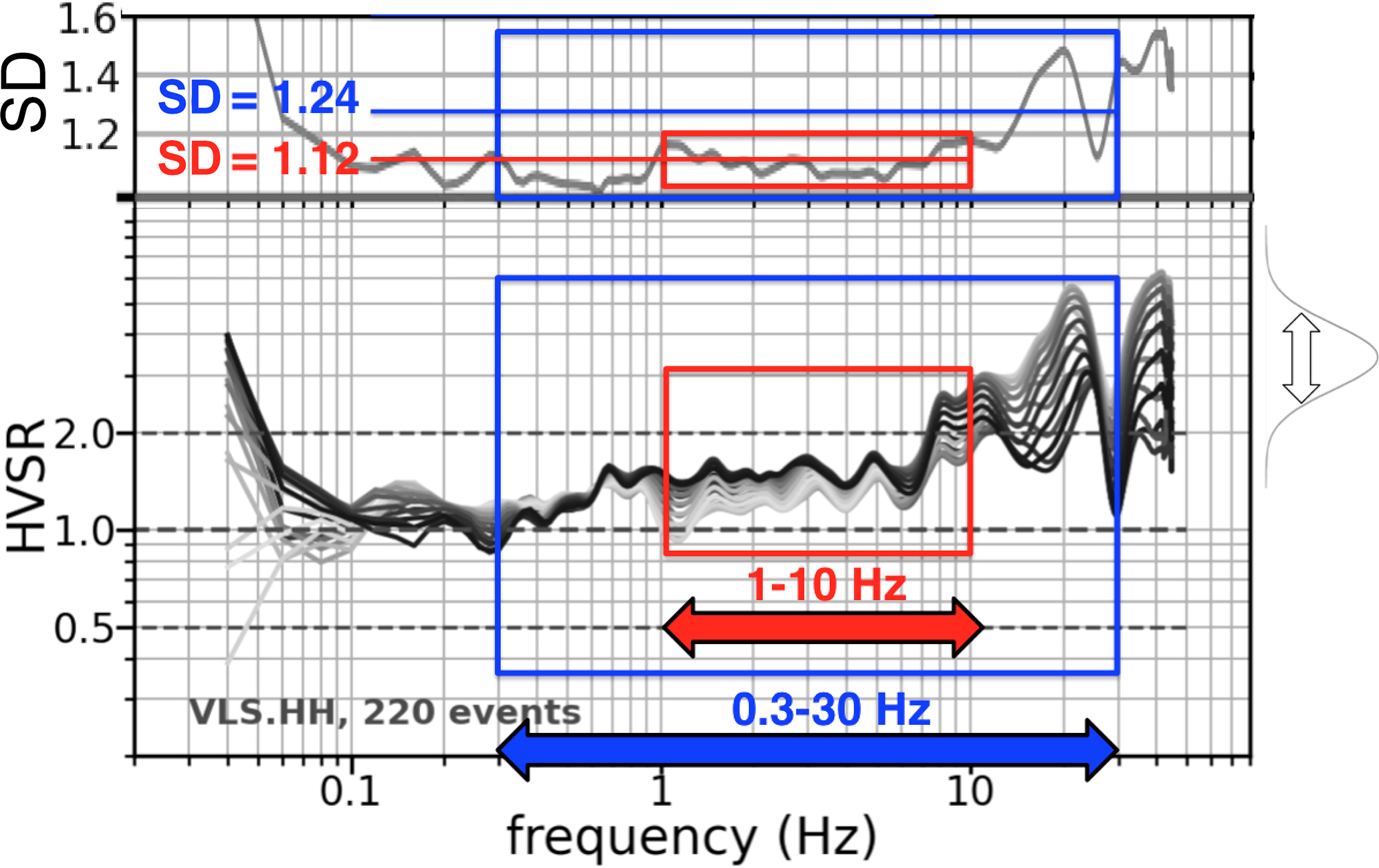 Figure 7Illustration of the two frequency bands over which the standard deviation from the rotations is averaged to derive an index of directional variability: 0.3–30 Hz (blue) and 1–10 Hz (red). For station VLS, the value is low for the narrow band (1.12) but high for the wider one (1.24) due to high-frequency variability above 9 Hz.