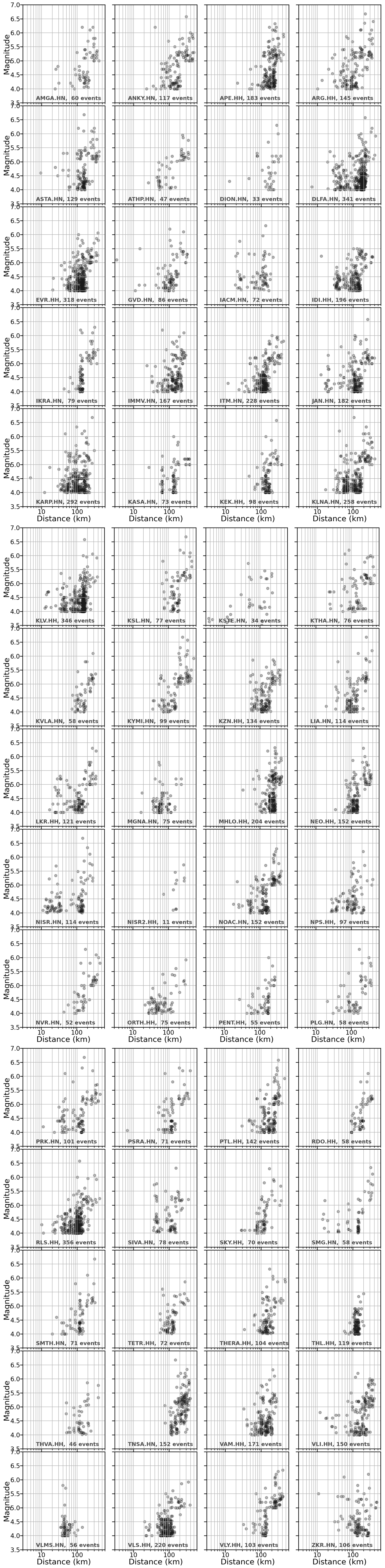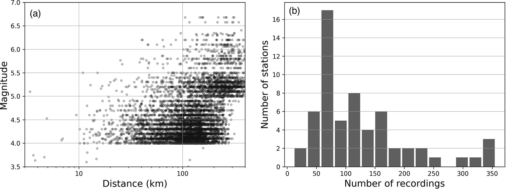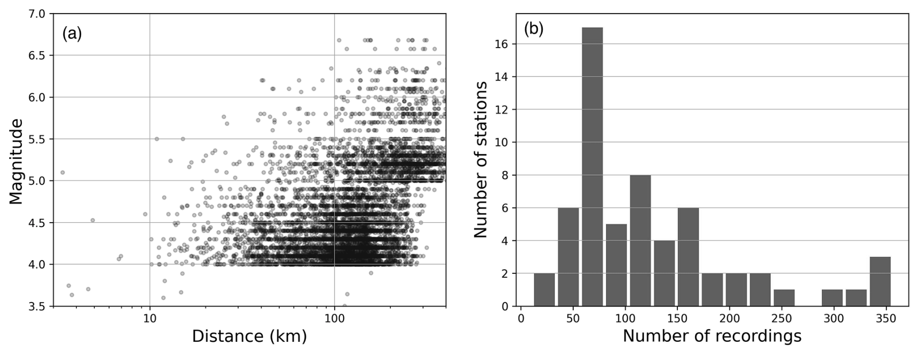 A threshold minimum magnitude of ML 4 was considered, dropping to ML 3.5 only in one case, for a station installed in 2021. The maximum distances considered varied according to noise level and scales from 150 km for smaller events to almost 500 km for large events. The M–R distribution for the ensemble dataset is shown in Fig. 2a. Figure B1 of the Appendix shows the M–R distribution for all stations in alphabetical order. Because the purpose of this dataset is not the development of ground motion models, the M–R distributions are given as an indication only, and we use local magnitude and epicentral distance metrics without giving the moment magnitude or rupture distance for large events. A total of 7512 three-component recordings are analysed in this study, coming from 1364 earthquakes. The number of three-component records per station is shown in Fig. 2b and is also listed in Table 1 as number of events recorded. The minimum number of usable recordings is 11, and the mean number of recordings is 125, although some stations have more than 300.