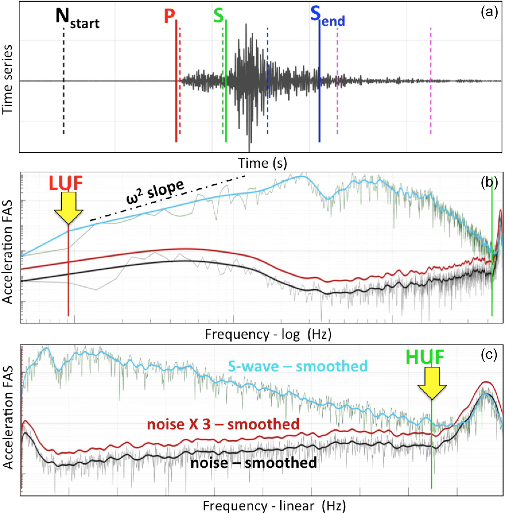 Figure 3Example of manual processing. (a) Windowing of a velocity trace in the time domain, selecting the beginning of the noise and S windows and the end of the S window. (b, c) Selecting the lowest and highest usable frequencies (LUFs and HUFs) in the frequency domain in log and linear scales respectively on the acceleration FAS.