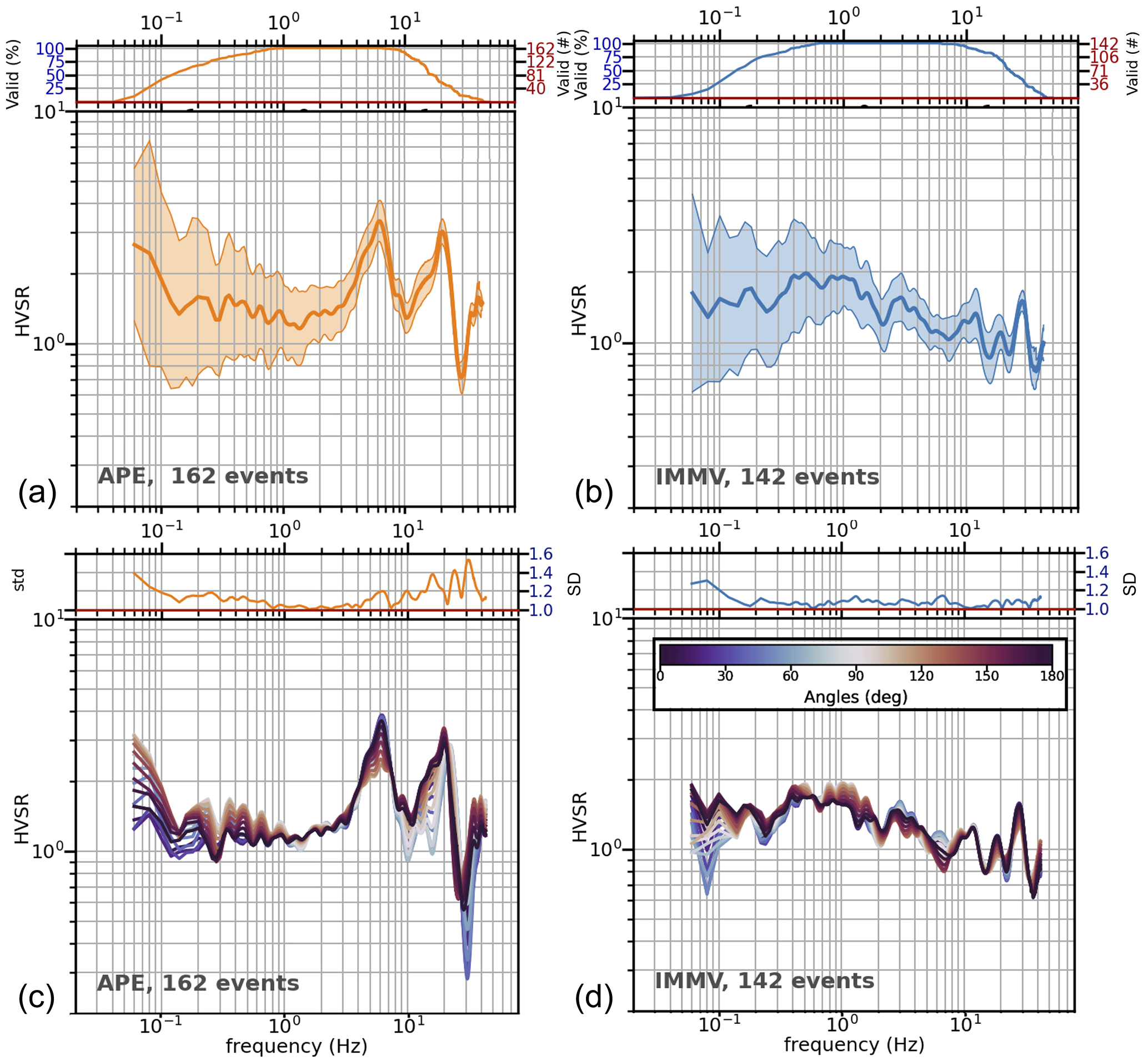 Figure 4Example of HVSR results for stations APE (a, c) and IMMV (b, d). (a, b) Mean, orientation-independent (SRSS) HVSR ± 1 standard deviation; the inset on top indicates the number and percentage of usable recordings per frequency. (c, d) HVSRs per component, as those are rotated 17 times by a 10° interval, from north to south; the inset on top indicates the standard deviation (hence, directional sensitivity or variability) per frequency.