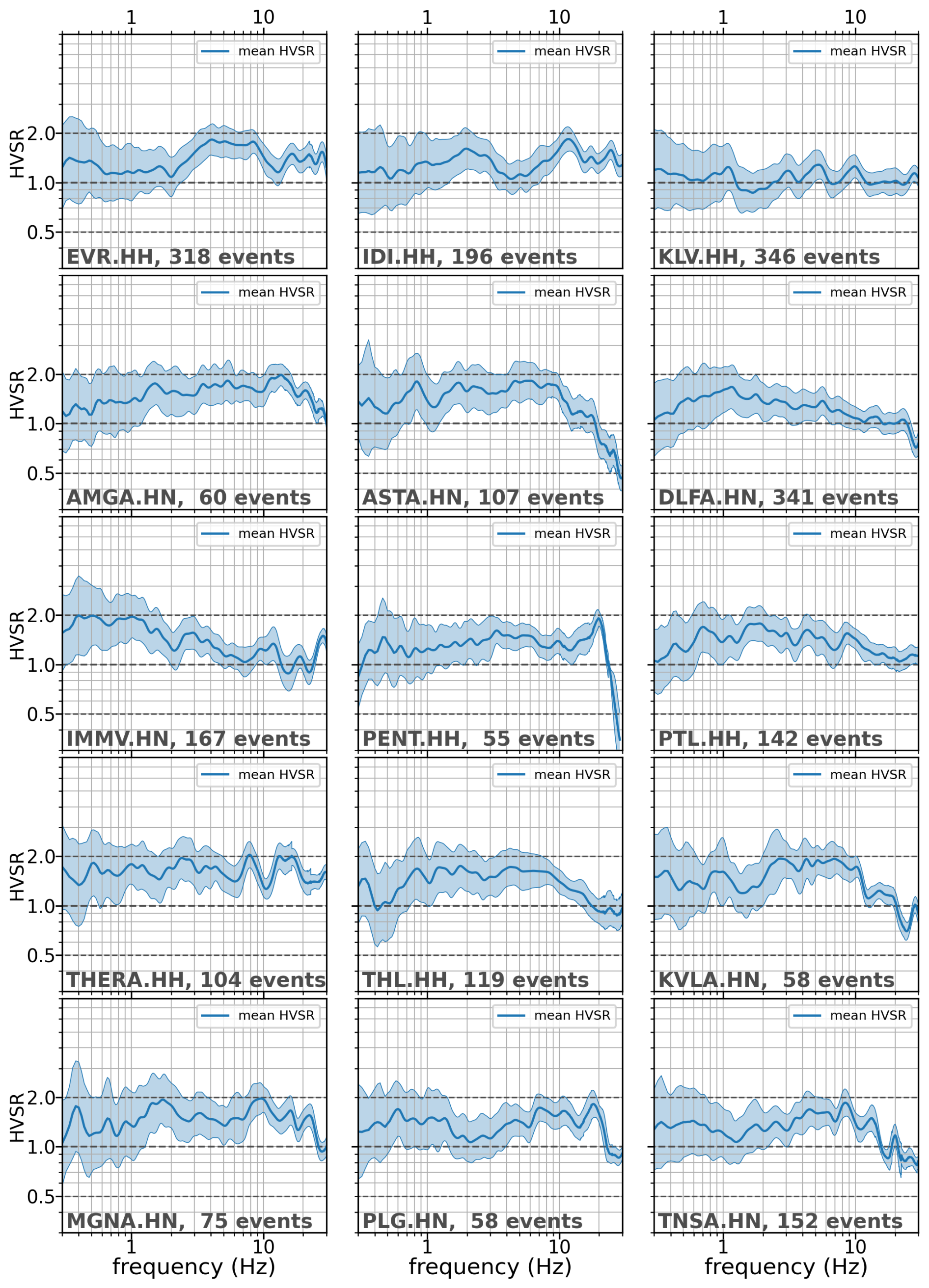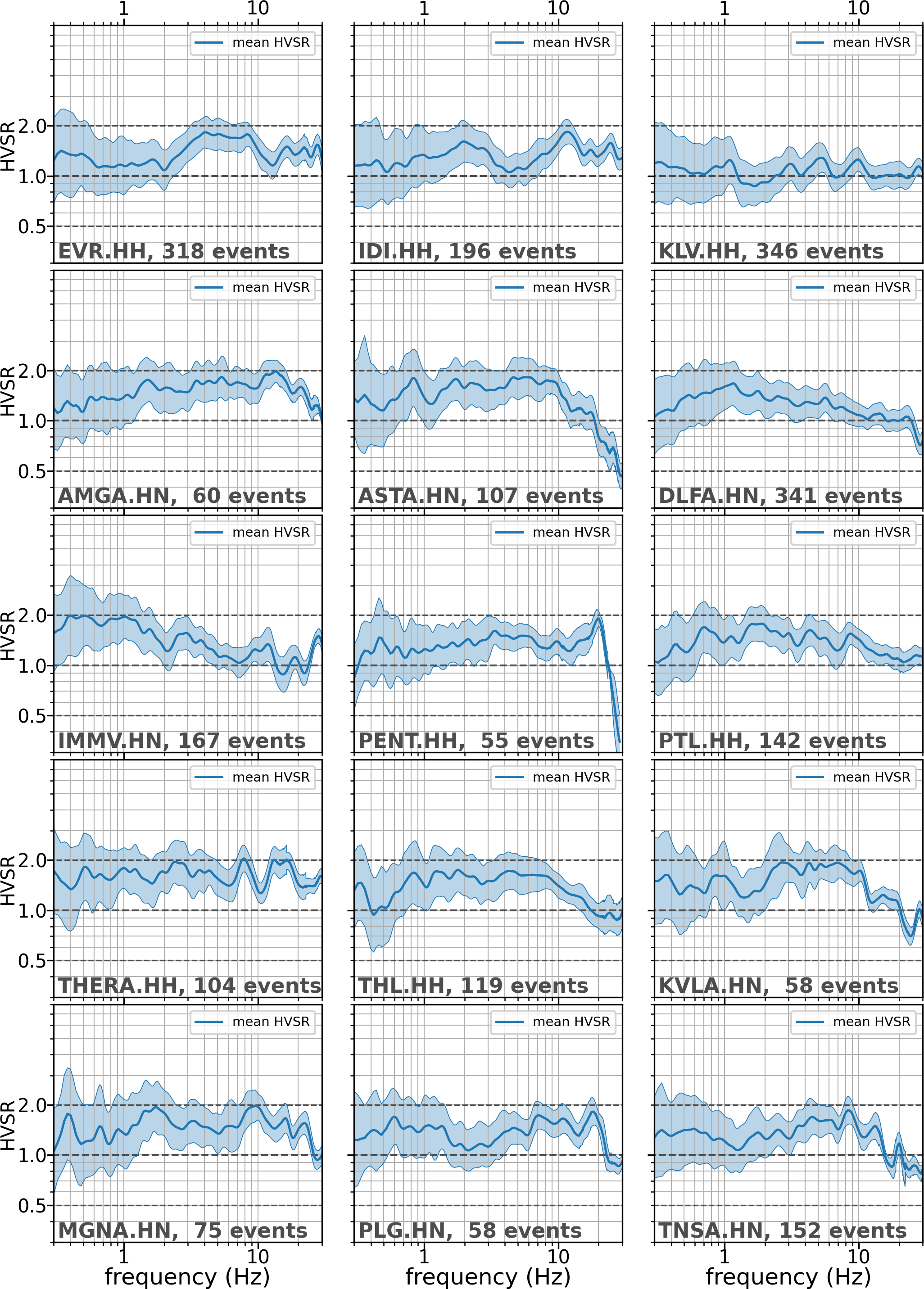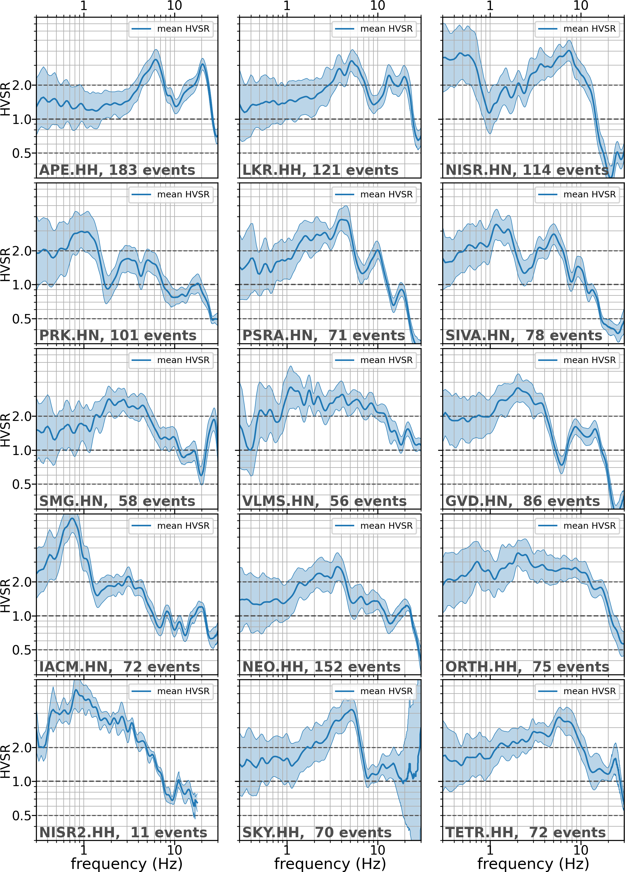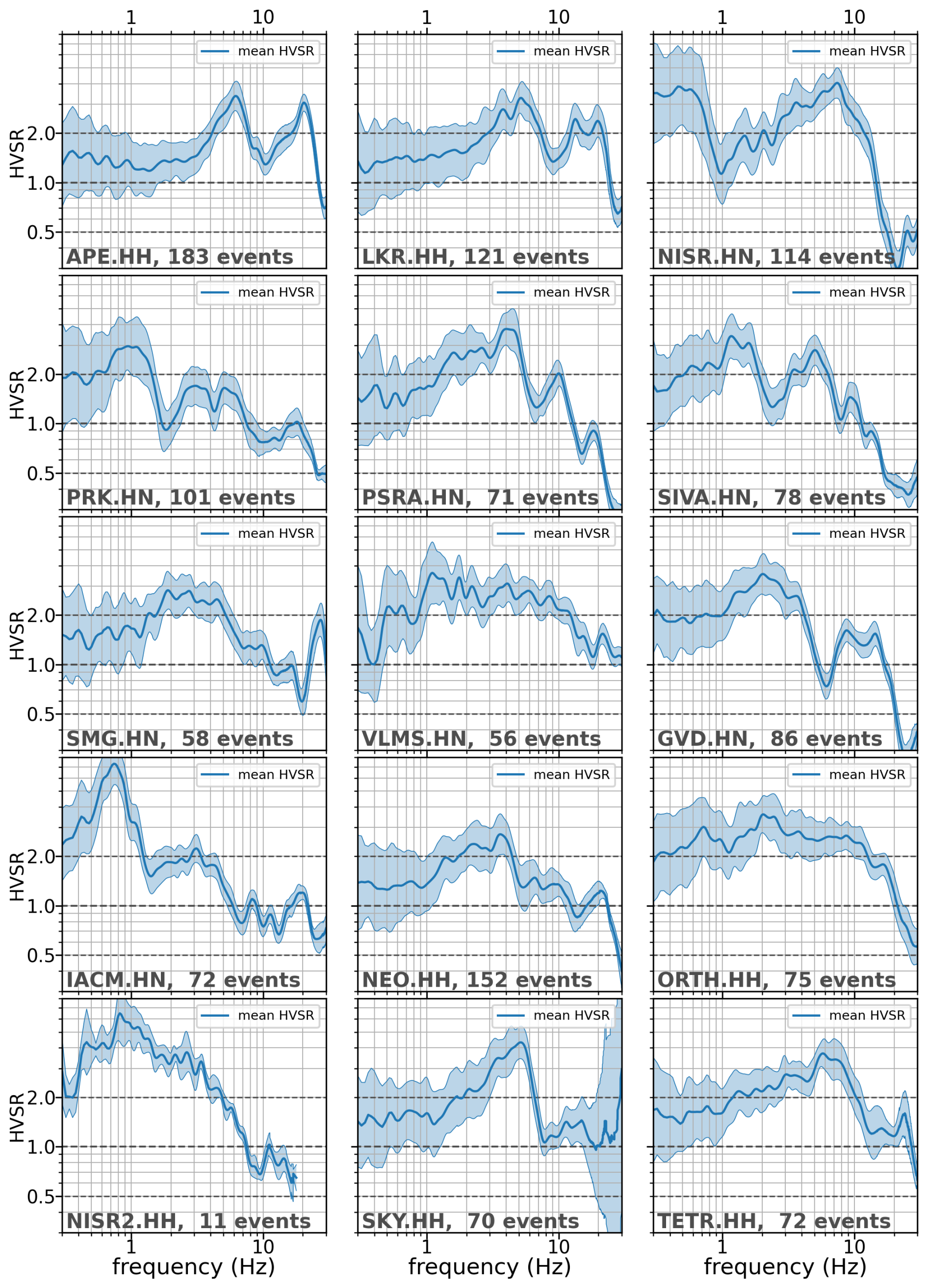 Figure B2Mean orientation-invariant (SRSS) HVSR ± 1 standard deviation for all stations. Dashed horizontal lines indicate a factor of 2 from unity. Responses within this range would indicate passable behaviour for a reference site.